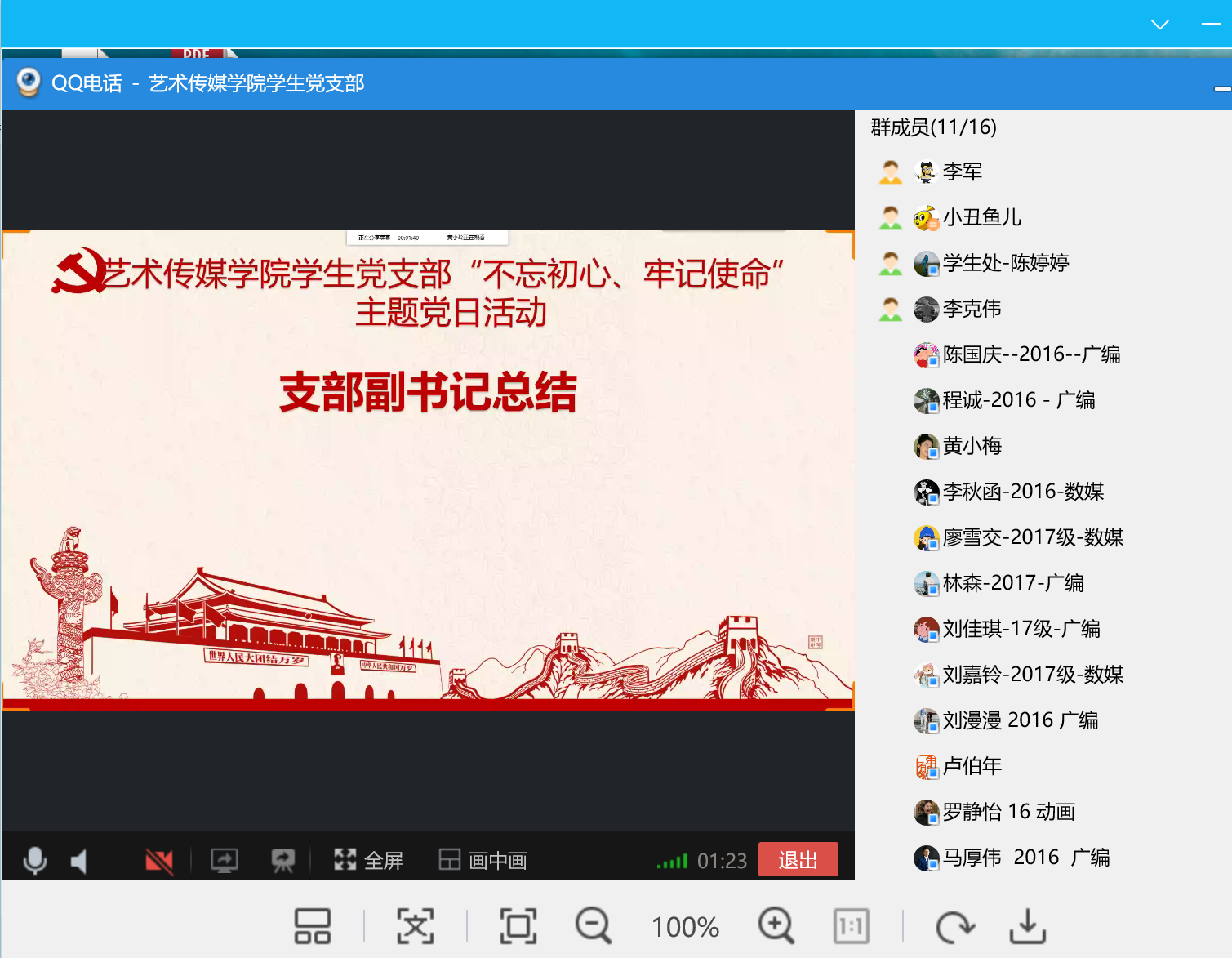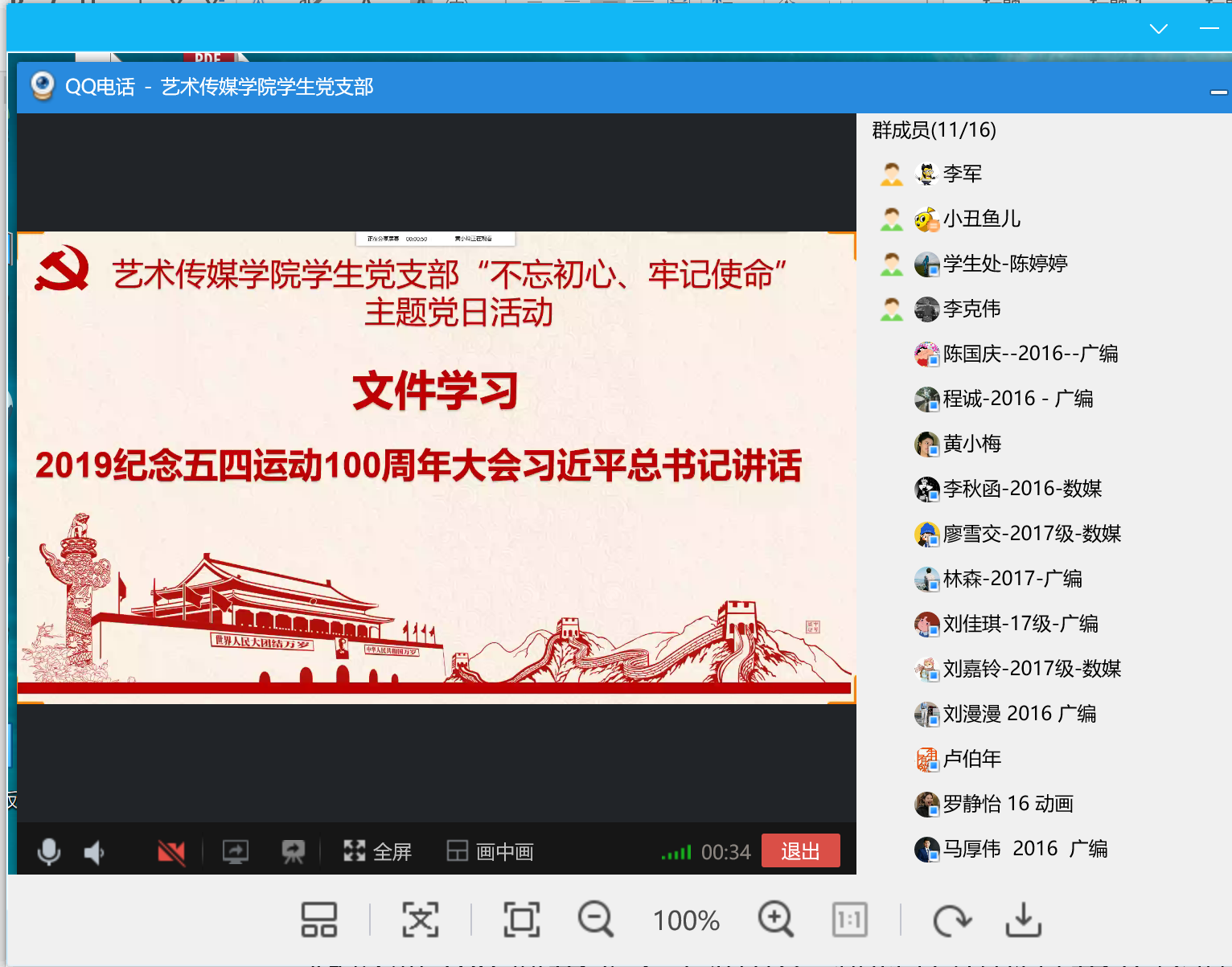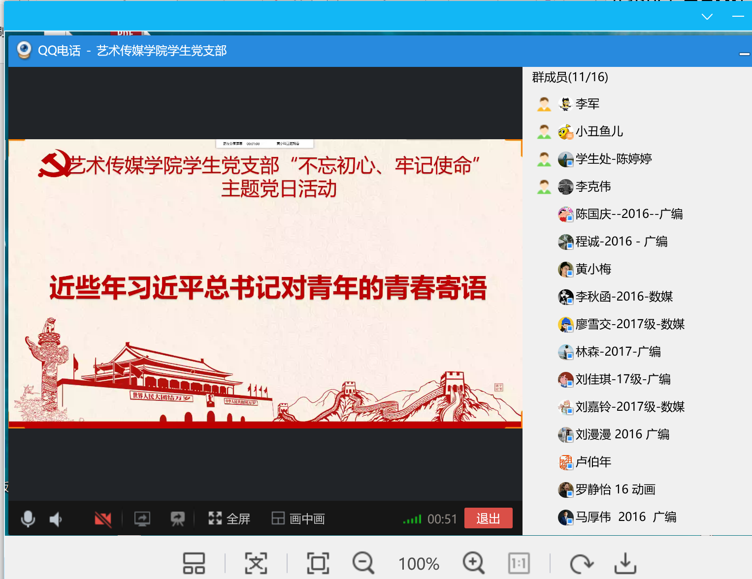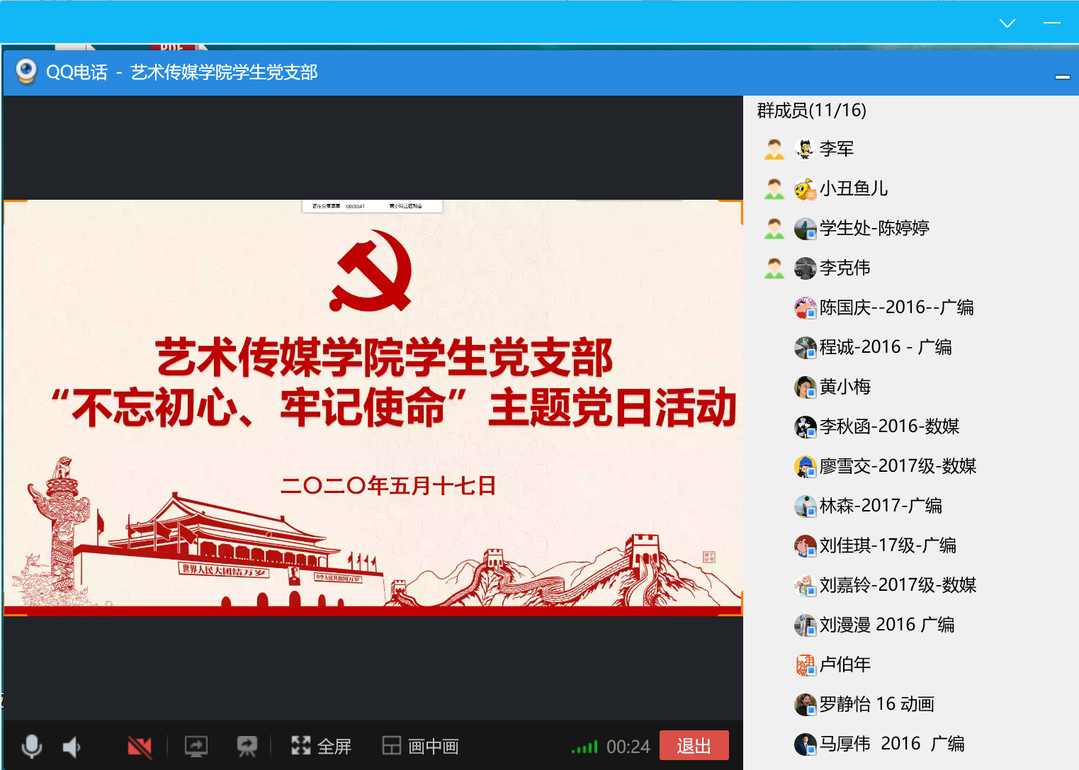 为深入学习习近平新时代中国特色社会主义思想,认真学习领悟习近平总书记对新时代青年的寄语与希望,将“不忘初心,牢记使命”主题教育持续化和常态化,从而更好发挥基层党支部的战斗堡垒作用和师生党员的先锋模范作用。2020年5月17日下午,艺术传媒学院学生党支部召开了以“践行初心使命,续写青春篇章”为主题的线上主题党日活动,活动由支部组织委员黄小玲老师主持,学生党支部全体成员参加。