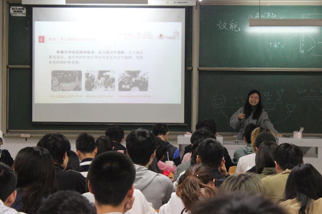 本次公开课由政治理论教研室的赖婷婷老师讲授《毛泽东思想和中国特色社会主义理论体系概论》第三章第二节--适合中国特点的社会主义改造道路。赖老师虽然是一名新进教师,但在前期为所授内容做了认真、充分的准备,在整个教学过程中做到了沉稳冷静、不怯场。在教学设计上,赖老师根据前期对学生的了解和调查,通过比较生动形象的案例和故事、内容丰富的短视频、深入浅出的讲解较好地帮助学生理解了新民主主义社会我国对农业、手工业和资本主义工商业进行社会主义改造的知识要点。在教学方式上,赖老师以大量的启发式的提问和互动让学生紧跟自己的思维,进行独立思考,帮助学生厘清、识记重难点,强化了教学效果。总体而言,赖老师的课堂氛围轻松和谐,学生学习热情积极。