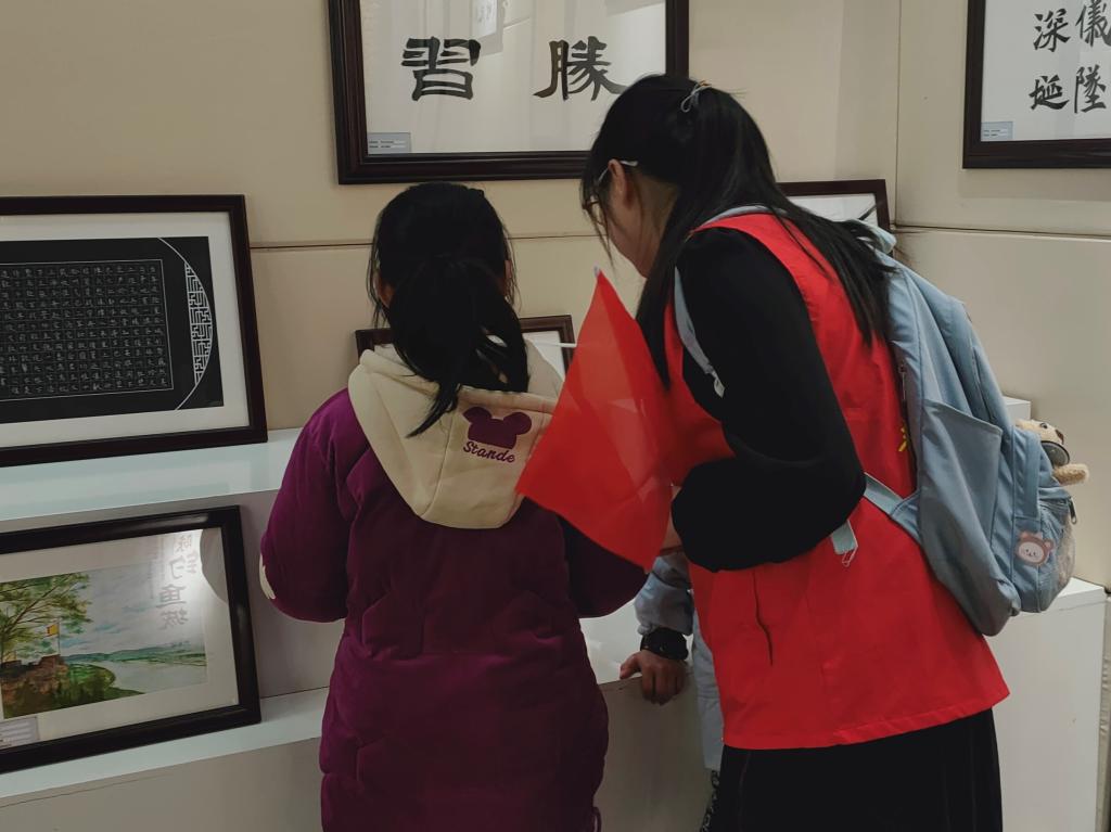 三楼展厅中陈列着许多和钓鱼城之战有关的冷兵器模型,在讲解员的带领下,一双双小眼睛看了这个看那个,逐一了解到了这些兵器的名字以及用途,对钓鱼城之战有了更深的认识。来到移通师生的书法作品展示区,这里陈列着许多来自移通师生们优秀的书画作品及文丛,它们或是描绘了钓鱼城古朴浑厚的城门,或是歌颂赞扬着钓鱼城在宋蒙之战中的英姿,小朋友们都感叹说,我以后要好好学习,争取像大哥哥大姐姐一样,能把自己的作品挂在博物馆里。