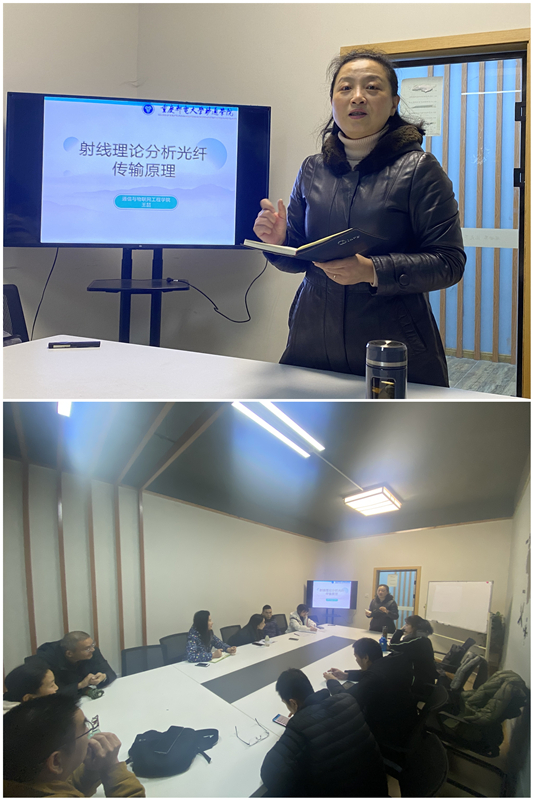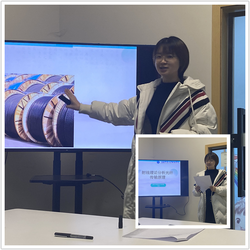 首先进行讲课比赛的是王喆老师,她以射线理论分析光纤传输原理作为本次的比赛内容。她用非常专业的语言通过说课环节较为详细地介绍了本次讲课的主旨、重难点、授课方法等内容,使在场所有教师都对其即将讲授的内容有了初步清晰的框架。王老师在讲课过程中以光纤结构的分析为中心,加以基本光学定律和定义的知识点回顾,从公式推导和射线理论分析两个方向,详细阐述了光纤传输的基本原理。