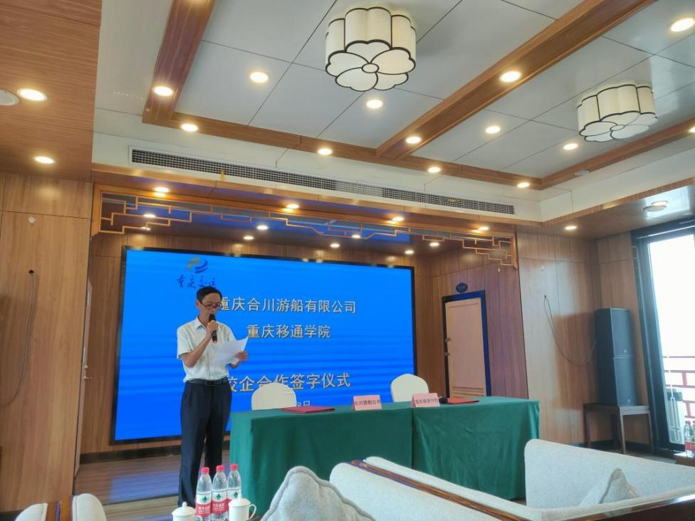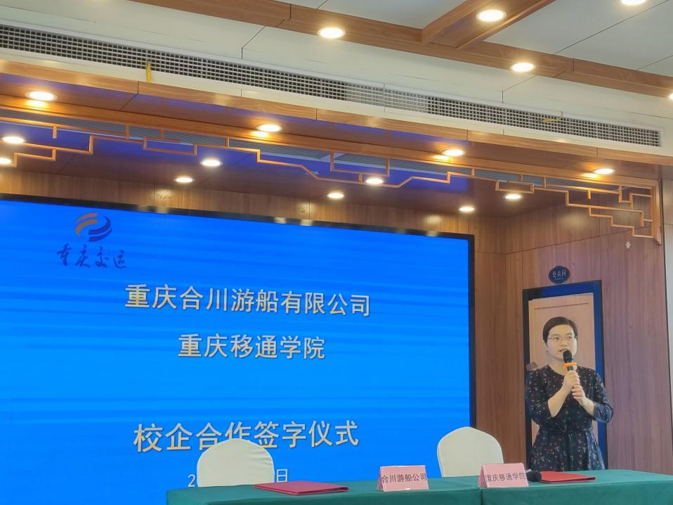 校长助理刘枚代表学校讲话。她说,随着生活水平的不断提高和科学技术的不断进步,社会需要的往往是能够推动社会发展前进的新一代全能型、复合型人才。重庆移通学院“四位一体双院制”正是以培养复合型人才为目标,帮助学生树立多元发展意识,探索多样化的知识技术领域,鼓励学生择新境,领锋芒。希望合川游船公司能在移通寻得适岗人才,更希望移通学子能为游船公司的发展添砖加瓦。