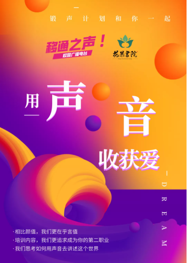 有人说:“声音是灵魂的音乐”,如果完满有声音,那一定是“锻声计划”的产出。“锻声计划”是校团委联合花果书院打造的一项声音塑造计划,以普通话训练作为重点内容,以舞台形体及主持方向课程作为支撑,同时将播音、舞台主持、片花制作以及电台相关软硬件的使用方法贯穿其中,倡导将声音作为第二职业来学习,旨在锻造出移通学院最动听的声音,打造出移通学院特有的声音培训基地,进而辐射到全校。