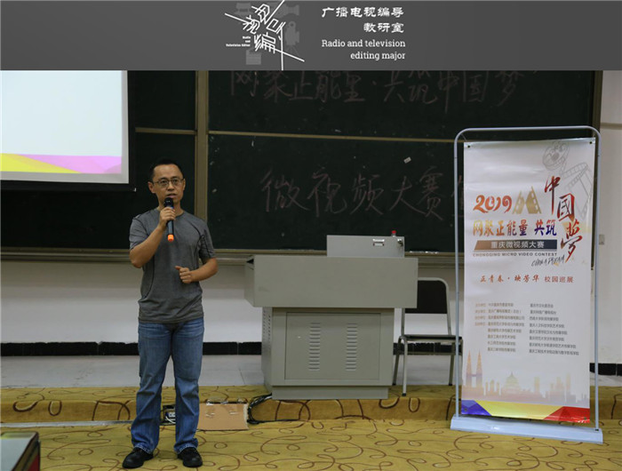 教师杨帆主持开场,对此次参会嘉宾及学生进行了简要介绍及欢迎,西南大学新闻传媒学院副院长赵剑致辞。赵剑副院长在致辞中首先对重庆邮电大学移通学院艺术传媒学院的大力支持表示感谢。赵剑副院长指出,重庆微视频大赛是由重庆市委宣传部和重庆市文化委员会共同主办的政府主导型赛事,对学生创作和指导老师都具有重要意义。