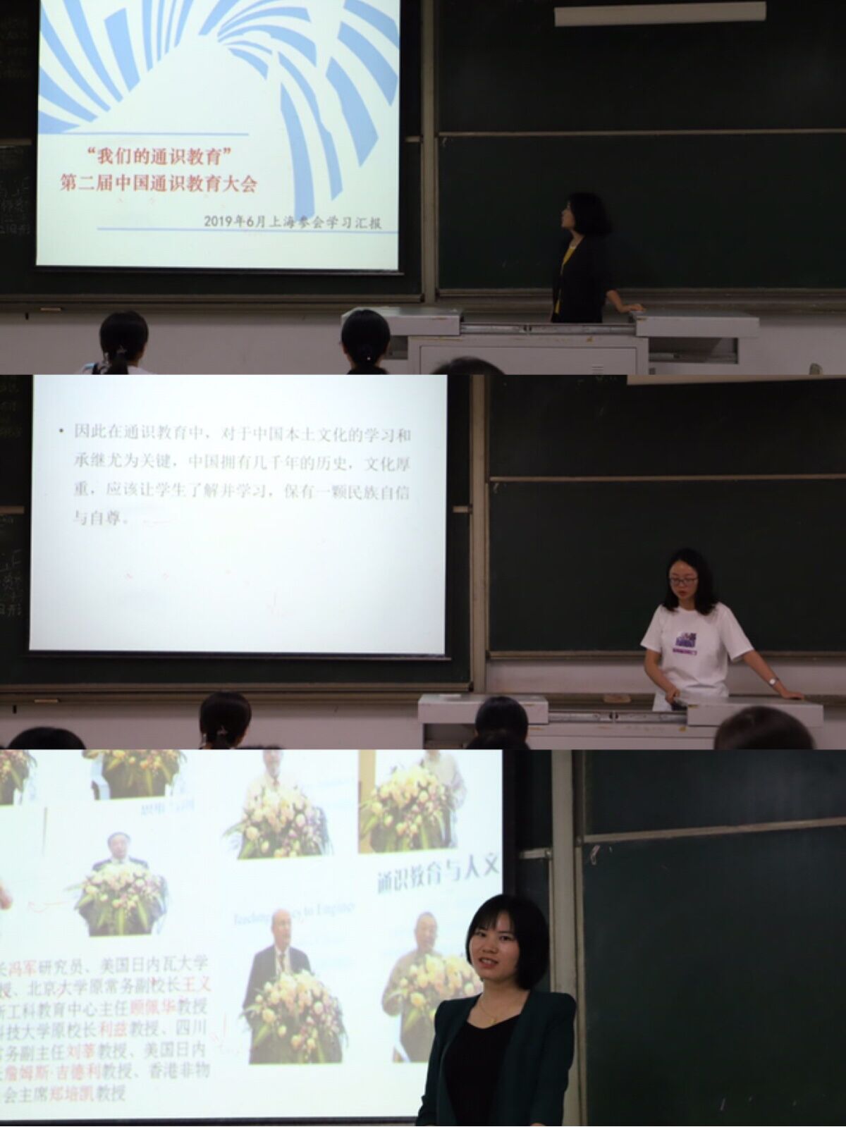 紧接着,周密老师和力冬梅老师分别分享2019年5月31日-6月1日参加的杭州举办的首届应用型大学通识教育国际会议。此次会议主题为“通识教育与高素质应用型人才培养”。周密老师从会议、会议议程、会议成果、参会收获四个方面分享她的杭州之行,对于应用型大学开展通识教育也有一定的思考和积累,对通识教育概念理解以及通识教育现状也有更加深刻的认识。力冬梅老师从微观着手为大家重点分享此次会议特邀嘉宾香港非物质文化遗产咨询委员会主席郑培凯教授主题发言,郑培凯教授在香港城市大学创立并主导实施通识教育20余年,对于通识教育的课程设计、文化的传播、艺术的沉淀作了很好的阐释,结合自己所担任的课程分享对自己的思考及收获。
