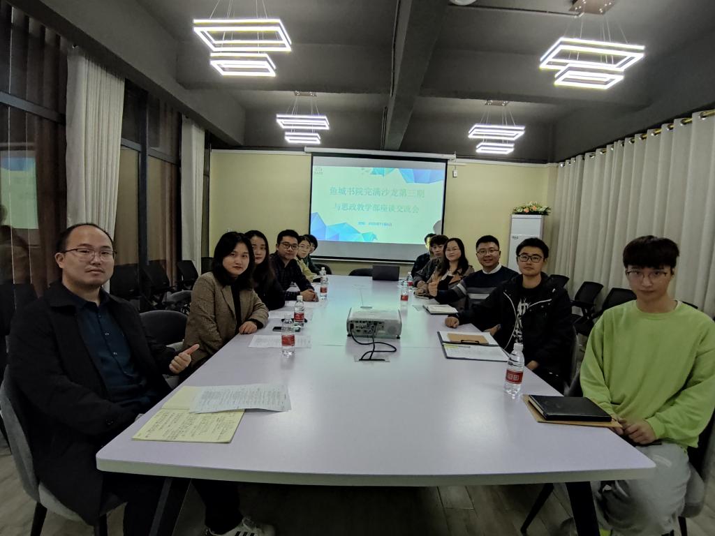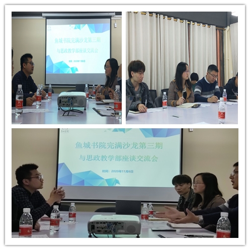 为深入贯彻我校发展战略, 进一步落实“四位一体+双院制”人才培养模式,推动思政教育与书院育人的联动融合,11月6日14点30分,思政教学部政治理论教研室与鱼城书院相关负责老师在鱼城书院办公室举行了交流座谈会。此次会议围绕“合作联动、协同育人”展开,会议由思政教学部政治理论教研室主任李阳老师、鱼城书院综合办公室主任佘贵隆老师主持,两个部门教师代表参加。
