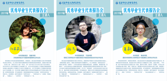 2019届优秀毕业生代表报告会于6月12日下午16时在下里巴人举行,来自竹逸书院、智能工程学院机械设计制造及其自动化专业的杨凡,鱼城书院、通信与物联网工程学院通信工程专业的王新以及别都书院、淬炼商学院财务管理专业的向芸萩三位优秀毕业生代表作了分享报告。