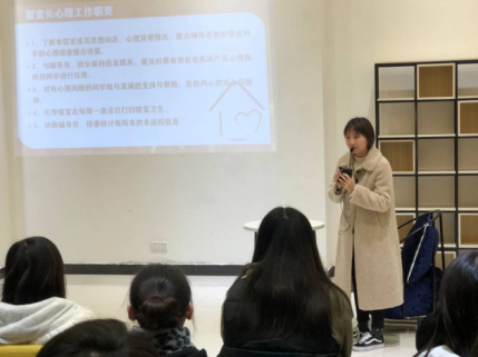 和谐干净、安全稳定的寝室环境能够提升寝室成员的安全感、幸福感和凝聚力。郭菲、向姝、郭超然老师分别从寝室的日常管理入手,说明寝室良好的生活环境和氛围,对同学们的成长影响重大。强调严格执行请销假制度,确保寝室同学的安全,牢记周一清洁日,还宿舍干净整洁。就网络赌博、校园贷、防火防盗等安全问题,向姝老师通过真实案例说明寝室长需要利用细致的观察发现学生的异常并及时通报,同时务必做好安全隐患排查,共同筑造和谐文明的寝室。