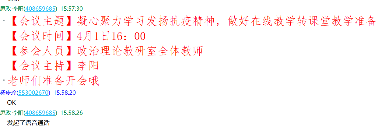 最后,各位老师就线上教学存在的问题和情况也进行了交流和反馈。李阳老师就丰富教学内容方面给大家推荐了学习强国、《在经历中学习》等优质教学平台和资源;其他老师就网络教学中学生学习积极性、教师课堂纪律管理等问题进行了热烈的讨论和交流。