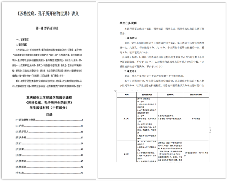 为了配套教学大纲,通识教学部哲学组的成员分工合作,利用寒假时间,编写了符合教学大纲的讲义和阅读材料,方便学生课后完成自主学习,并以此为起点,培养学生良好的阅读习惯,提高阅读能力。学生通过阅读材料或讲义,并以读书笔记或读书报告的形式,既掌握了必要的基础知识,也进一步锻炼了自己的阅读和写作能力,还对某些专业问题有了更深的感悟和解读。通过这种模式,学生学到的不仅仅是知识,而是培养了一种深入学习、深入研究的习惯。