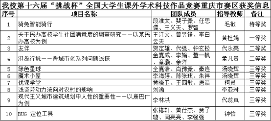 近日由团市委、市教委、市科技局、市经信委、市大数据发展局、两江新区党工委、两江新区管委会、市科协、市社科联、市学联共同组织开展的第十六届“挑战杯”全国大学生课外学术科技作品竞赛重庆市赛区的竞赛工作落下帷幕。我校共申报32件作品,通过校内层层选拔,报送15件作品参与市赛,分别获得特等奖一件、一等奖一件、二等奖两件、三等奖六件,再次刷新我校参加挑战杯赛事的新纪录。