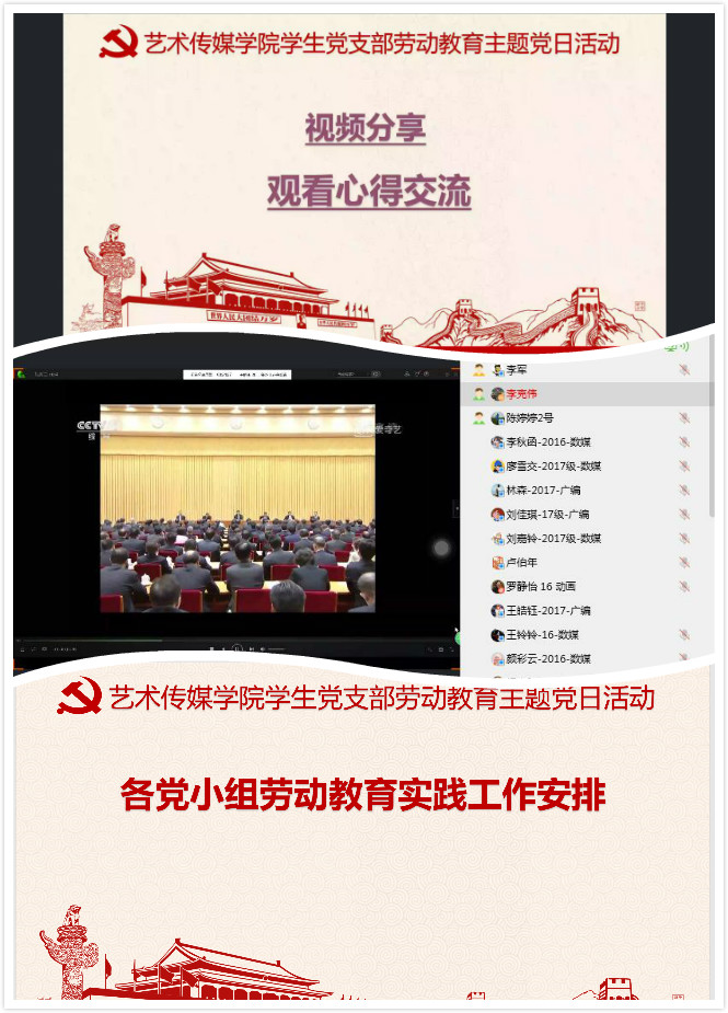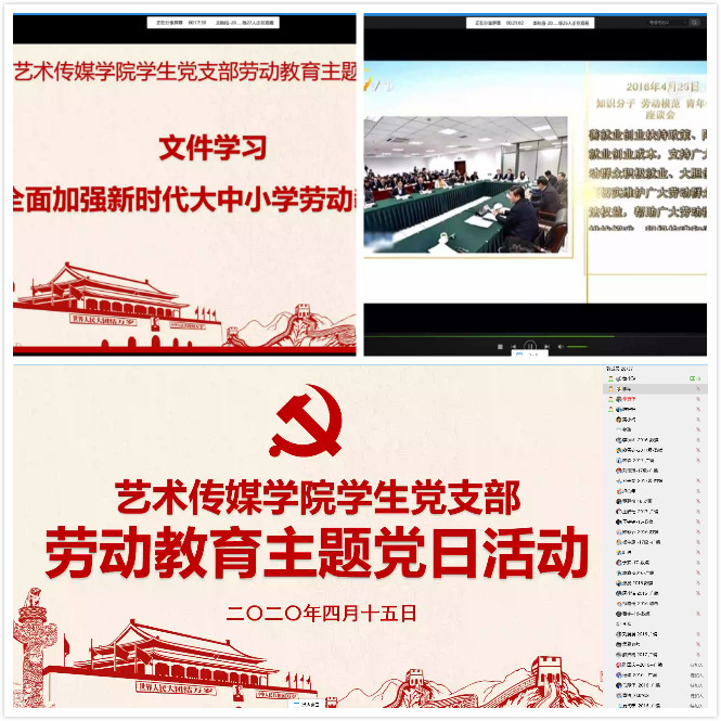 为深入学习习近平新时代中国特色社会主义思想,积极贯彻落实中共中央、国务院《关于全面加强新时代大中小学劳动教育的意见》文件要求,学习领悟习近平总书记给北京大学援鄂医疗队全体“90后”党员的重要回信精神,切实发挥我院学生党支部的战斗堡垒作用和党员的先锋模范作用。2020年4月15日下午,艺术传媒学院学生党支部召开了以劳动教育为主题的线上主题党日活动,活动由支部组织委员黄小玲老师主持,学生党支部全体成员参加。本次主题党日活动围绕文件学习、视频分享、心得感悟及劳动教育实践安排四个方面展开。