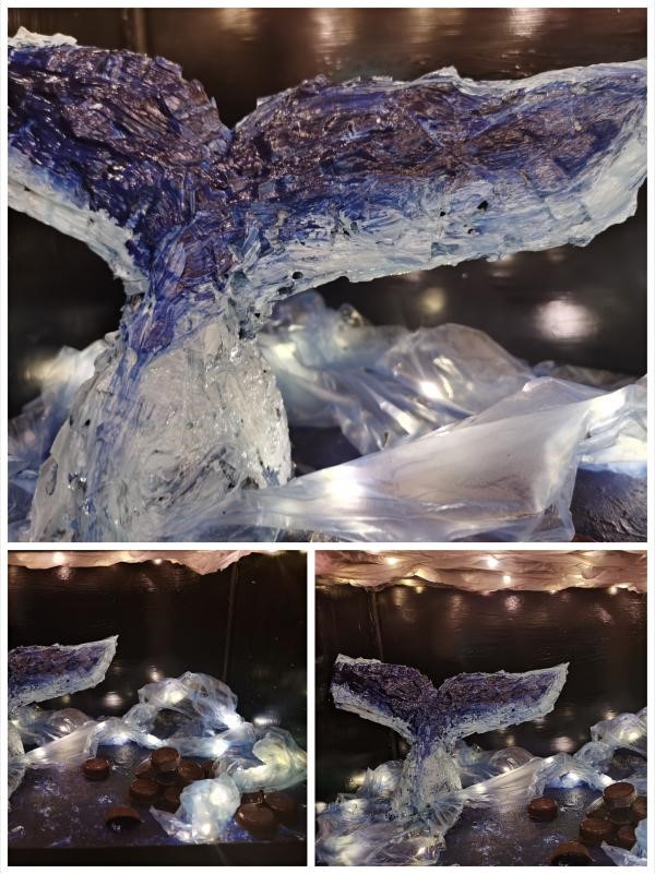 在这个快速发展的时代,陆地上的一切都带着人类文明的痕迹。海洋,这个神秘而又迷人的领域,是人类尚未完全开发的自然之地,但随着人类的过度开发,海洋污染日益加深,海洋动物的生活环境也受到严重破坏。作品《鲸》围绕海洋,从纪录片《鲸鱼的轨迹》中获得灵感,蓝白为底的“塑料”海浪,以塑料为主原料创作出一条残缺鲸尾,参赛选手在表达海洋污染的景象中,以塑料袋为浪的原型,残缺的鲸尾最为突出,暗喻海洋因为人类污染导致的内部残缺不堪,外表的鲜丽已经快掩盖不住本身受到的伤害。作品《鲸》将美感与对海洋污染的反思融入作品中,在给观众带来美的视觉效果的同时,也将海洋污染独特的表现出来,不由的让人想要去关注海洋污染问题,一起呼吁保护环境。