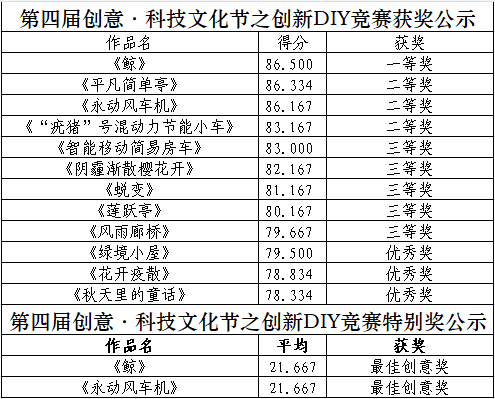 经过评委的严格评选,最终确定并公布决赛作品的排名。奖项共分为一等奖、二等奖、三等奖、优秀奖、最佳创意奖五种类别,最佳创意奖由设计创意分加设计理念分得分之和的平均分最高分作品获得。作品《鲸》的独特魅力获全场评委和观众的认可,拿下大赛的第一名,其余优秀作品依照得分进行排名。