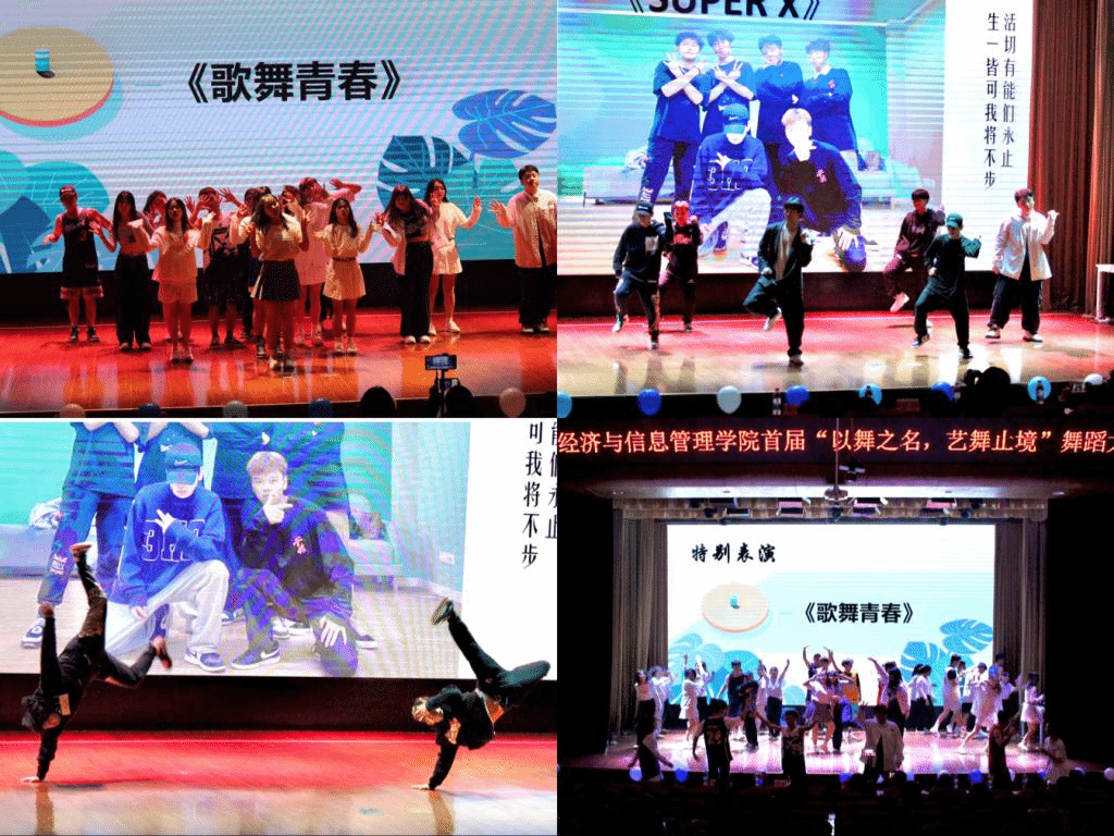 青春爱舞,狂舞青春。为丰富我校学生业余生活,加强学校精神文明建设,展示当代大学生风采,提高大学生鉴赏美之能力,为每一位舞蹈爱好者提供展示自我之平台。我院于12月10日晚上八点于下里巴人剧场隆重举行数字经济与信息管理学院首届“以舞之名· 艺无止境”舞蹈大赛。本次大赛邀请到数字经济与信息管理学院副院长任瑞娟老师,团总支书记马莉老师,艺术修养与实践版块指导老师路丽帆老师,志愿服务版块指导老师彭薇薇、王瑞老师,社团活动版块指导老师张婷、刘琳老师,竞技体育版块指导老师汪立、吴生亮老师,宣传推广版块指导老师曹文扬老师作为评委出席。