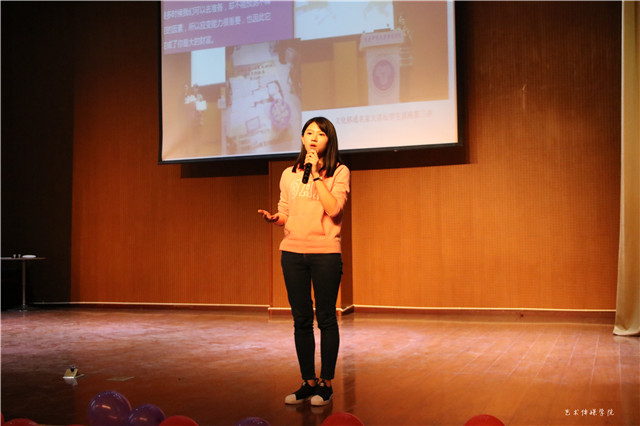然后向大家分享的是2015级英语专业的张婉娟同学,她说坚持做一件事情也许会很辛苦;坚持下去不一定会成功,但是,不坚持下去就一定不会成功;半途而废是最可悲的。也正是因为她的坚持和有始有终,成功跑完3000米。