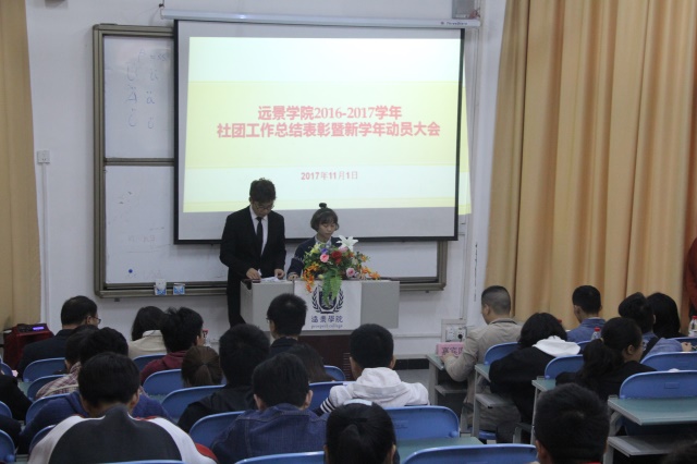 11月1日中午12时,久违的阳光暖暖的照在菩提书院的上空,树木、花草、同学们都贪婪的迎接着阳光的照耀,菩提书院显得格外的舒服惬意。而此刻,阶梯教室里面暖暖的音乐缓缓响起,一年一度的远景学院社团总结表彰暨新学年动员大会正如期举行。学院团总支书记曾明珠、各社团指导老师、团总支学生会书记主席、各社团新老社长等应邀出席了此次大会。