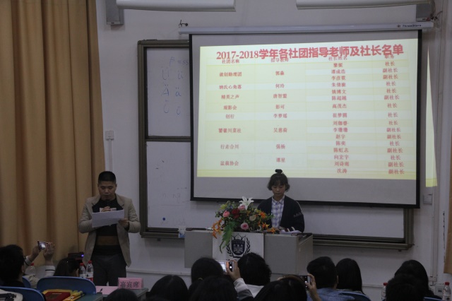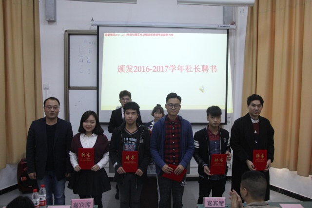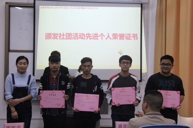 曾老师作为代表首先宣读了《远景学院2016-2017学年社团考核结果及表彰决定》文件,社团考核既是学院对社团发展建设的引领,同时也是检验各社团上学年工作的成绩,盆栽协会等2个社团被评定为优秀社团、观影会等5个社团被评为合格社团;杨志等2名同学被评为优秀社长;董梦雅等9名同学被评为社团活动先进个人。强杨老师为所有考核合格的社长、副社长颁发了聘书;吴慈荷老师为社团活动先进个人颁发了荣誉证书;谭星老师为获得优秀社长的同学颁发了荣誉证书;郭淼老师为获得了优秀社长的同学颁发了荣誉证书。