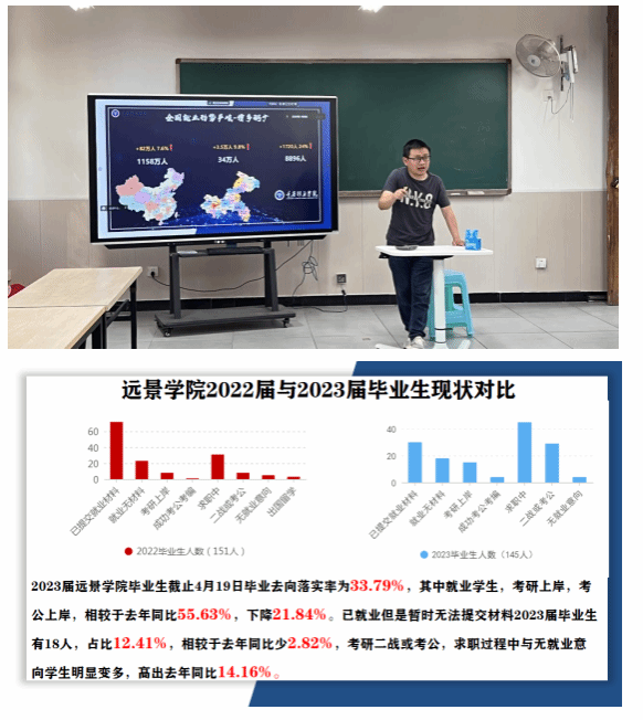 2023年全国高校毕业生再创新高,市场与企业环境也不太理想,李院长结合社会发展与时代现状,如就业群体结构性矛盾、预期与现实就业差异等问题,综合相关因素分析其带给大学生的就业影响。通过对远景学院2022届与2023届毕业生同期的就业形势对比以及就业情况概述,结合“辅导员+导师”信息反馈,李军院长表示,就业很难一步到位,即使经受挫折也要以积极正确的态度去面对,在尝试过程中不断认知、提升自我。