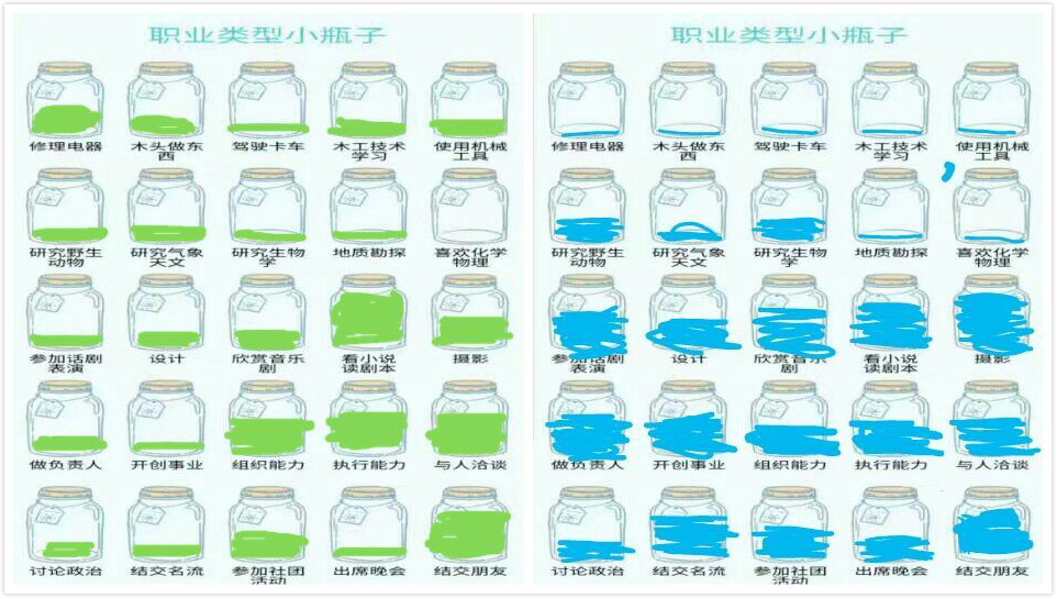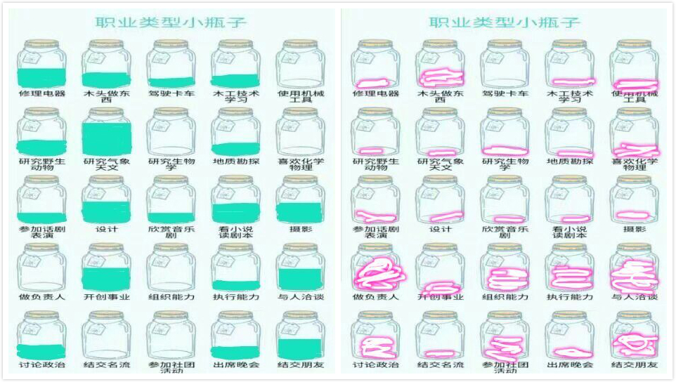 曾获诺贝尔物理学奖的华人科学家丁肇中说过:“兴趣比天才重要。”兴趣是最好的老师,从“三分热度”到“十分热爱”,离不开能力与兴趣的结合,也更有可能取得职业生涯的成功。根据霍兰德职业兴趣测试表改编的“职业兴趣小瓶子涂鸦”环节,不仅让参与者们体验到了涂鸦的乐趣,更让同学们通过对照表直观地剖析自我,发现自己擅长、喜爱的职业。
