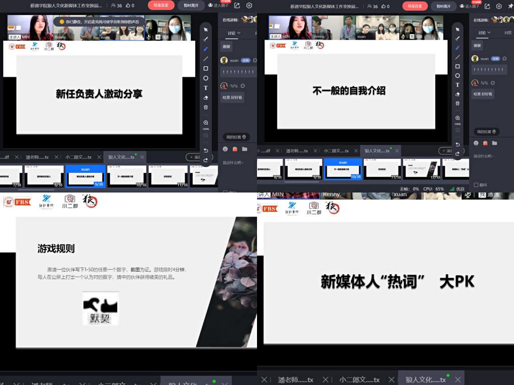 校企导师分享之后,新任工作室学生负责人代表姚城同学发言,她首先感谢各位老师的认可,工作室这一年的经历,通过项目实践增丰富了工作与活动的实战经验,管理中训练了全局观,同时锻炼了耐心、责任感,培养了严明的组织性和纪律性,以及沟通与决策能力。现在工作室迎来了新鲜血液,希望能和各位同学一起共同进步。工作室新成员也通过视频等形式纷纷呈上了丰富多彩的自我介绍,并积极的参与了新媒体人网络用语互动游戏。最后,企业导师呈现了为各位成员准备的特别礼物,将活动的氛围推向了高潮。通过这个环节,同学们收获了满满的感动,对工作室未来学习和工作也充满了期待。