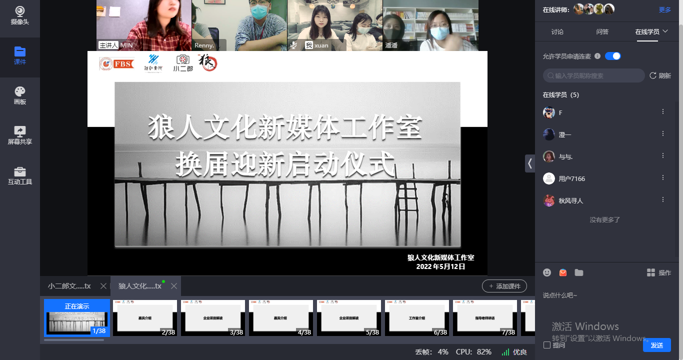 为进一步推动狼人文化新媒体工作室实战平台建设,探索“商科课程+企业导师+工作室+项目实战+完满通识”人才培养路径,狼人文化新媒体工作室于2022年4-5月紧锣密鼓地开展了工作室面试纳新工作,并于5月12日下午16:00举行了换届迎新启动仪式。工作室校内导师市场营销教研室潘泉宏老师、王思捷老师,企业导师重庆小二郎公司知识付费事业部总监任聪老师、影视部编辑饶晨霖老师,以及狼人文化新媒体工作室的全体成员参与了此次线上活动。换届迎新启动仪式从企业导师宣讲、校内导师工作室工作指导分享、新加入成员自我介绍及新媒体人互动游戏四个议程展开。