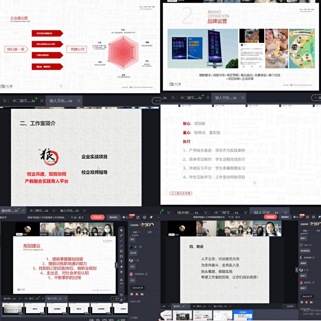 首先,企业导师重庆小二郎公司知识付费事业部总监任聪老师对公司业务板块以及工作室规划进行了简要阐述,并宣布了工作室新晋负责人,授予工作室成员工牌及荣誉证书。任老师对新加入工作室的同学表示欢迎,希望同学们在边学边做中不断自我积累,通过校企实战提前掌握职场基础技能,同时也提前训练职场通识技能,为最终找到自己匹配的岗位做好相应的职业规划。接着,企业导师重庆小二郎文化传媒有限公司影视部编辑饶晨霖,就项目培养途径进行了详细的介绍。随后校内导师潘泉宏老师针对工作室的定位、工作开展、组织结构等进行了指导分享,并寄语“人不立志,行动就无方向,为志向奋斗,去充实人生!”能量满满的话语感染了线上的所有学生。最后,校内导师王思捷老师就职场心态、职业技能、工作沟通技能方面进行了指导分享,表示认真负责、沉下去是初入职场的首要条件,只有不断的踏实积累才能在实战中收获理想。