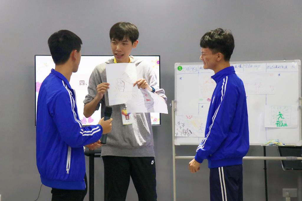 在总结了各种特质的共性后,课程进入“我们是一个team”阶段。为展示团队合作能力,每小组都分发了纸张和画笔,他们需要创作自己的队徽,小组每一位成员充分发挥天马行空的想象力,为队徽的创作添砖加瓦。并选派一名代表讲述队徽创作中每位成员所绘画部分的含义。琳琅满目的队徽呈现在展板上,彰显着团结的力量。