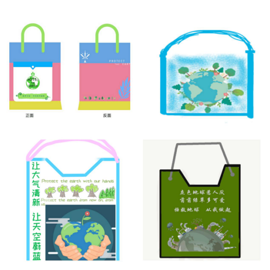 我国是世界十大塑料制品生产和消费国之一,而塑料袋等塑料制品已成为白色污染的主要元凶,这些废旧塑料散落在水体和土壤中,不仅造成“视觉污染”,也因其难以降解对生态环境造成了严重危害,影响人们的生活健康。为呼吁人们在日常生活中尽量减少塑料制品使用量,降低白色污染,“绿”制手袋降污染活动也鼓励同学们自行设计制作环保手袋。大家发挥想象力创作力,将“Protect The Earth”、“保护地球环境,共创美好家园”等标语设计在自己的环保手袋上,以此提醒人们保护环境就是在保护地球。彭臻同学在环保袋上印刷出环保标识,将绿色地球作为手袋的主要图案,背面还印有森林、绿叶,并将提手部分设计为绿色,且整体色彩多样,富有生机。用这样的设计倡导更多的人在日常生活中使用环保袋,避免造成资源浪费和环境污染。