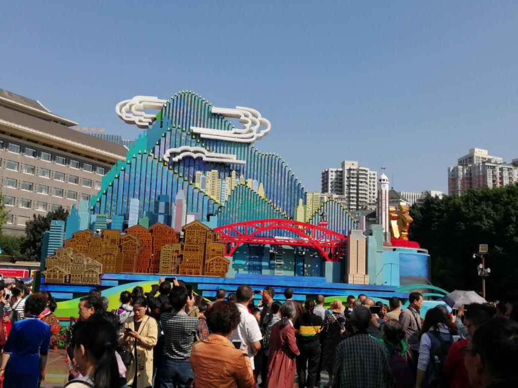第一件事情莫过于10月1日阅兵式上的重庆花车回家了,并且前一天才开始对外展出。2019级戴鑫同学回忆起那时的情况都还略带兴奋:我远远的就看见博物馆大门前人山人海,走进一看才知道原来是正在举行建国70周年庆祝活动,在10月1日中国成立70周年阅兵式上进行花车游行的“重庆”花车回到了重庆。其实在阅兵式上我就看到了这个花车,但近距离看更能看到它上面的细节:穿行在高楼里面的地铁、长江索道、解放碑等无不代表重庆。