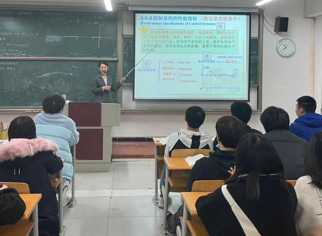 王瑞芳老师在讲解《自动控制原理》课程中“二阶欠阻尼单位阶跃响应性能指标计算”时强调,在系统稳定的前提下才能进行性能指标的计算,进而引申到国家社会稳定性的意义,国家社会稳定才能进行物质、政治、精神、社会、生态文明建设,才能有条件建设美好家园;家庭稳定家人才能安居乐业,人们才会有幸福感,有好的生活体验。稳定高于一切,控制系统也是一样的,控制系统稳定才可以谈动态性能、稳态性能,如果不稳定,谈性能指标没有任何意义,需要先解决稳定性问题。在学生对稳定的前提有了更透彻的理解后,接着,王老师就二阶系统欠阻尼单位阶跃响应下的性能指标的计算展开了详细的讲解与分析,并总结了二阶系统性能分析的要点。