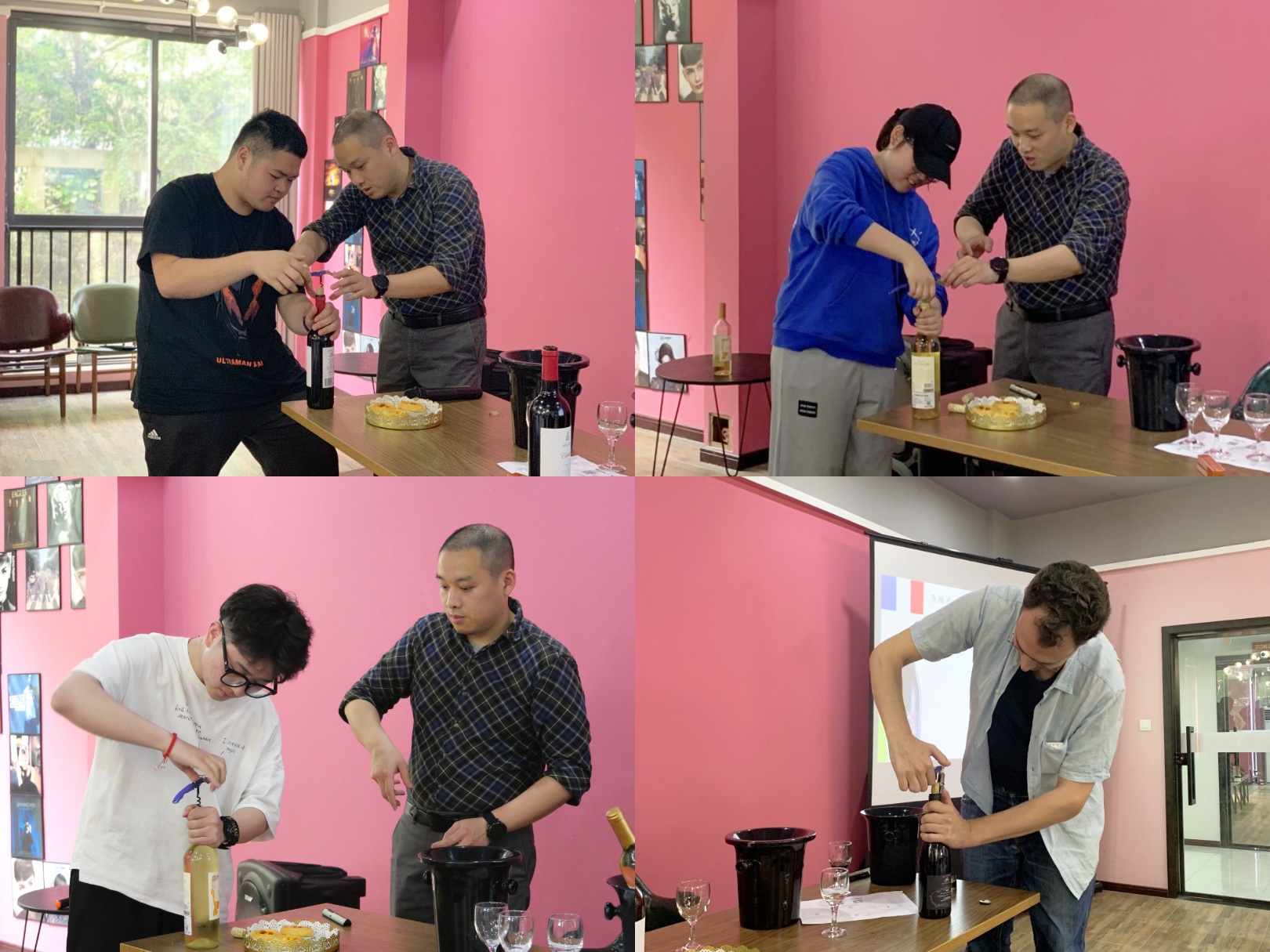 除红酒本身的理论知识以外,方老师还为同学们演示了三款葡萄酒刀的使用方法及相应的使用场合。如最常用的一款海马刀,“第一步,用小刀将瓶口边缘切开;第二步,将开瓶器顺时针旋入瓶塞,将两边把手向下压,利用杠杆原理撬动瓶塞并向外拨出。”演示完毕后,方老师邀请三位同学与外教Elias进行实操,现场验收教学成果。
