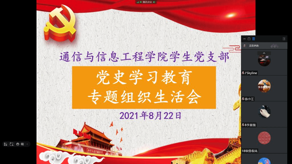 2021年8月22日,通信与信息工程学院学生党支部全体党员通过腾讯会议平台召开“学党史、感党恩、跟党走”党史学习教育专题组织生活会,大会由通信与信息工程学院学生党支部副书记杨青松主持。