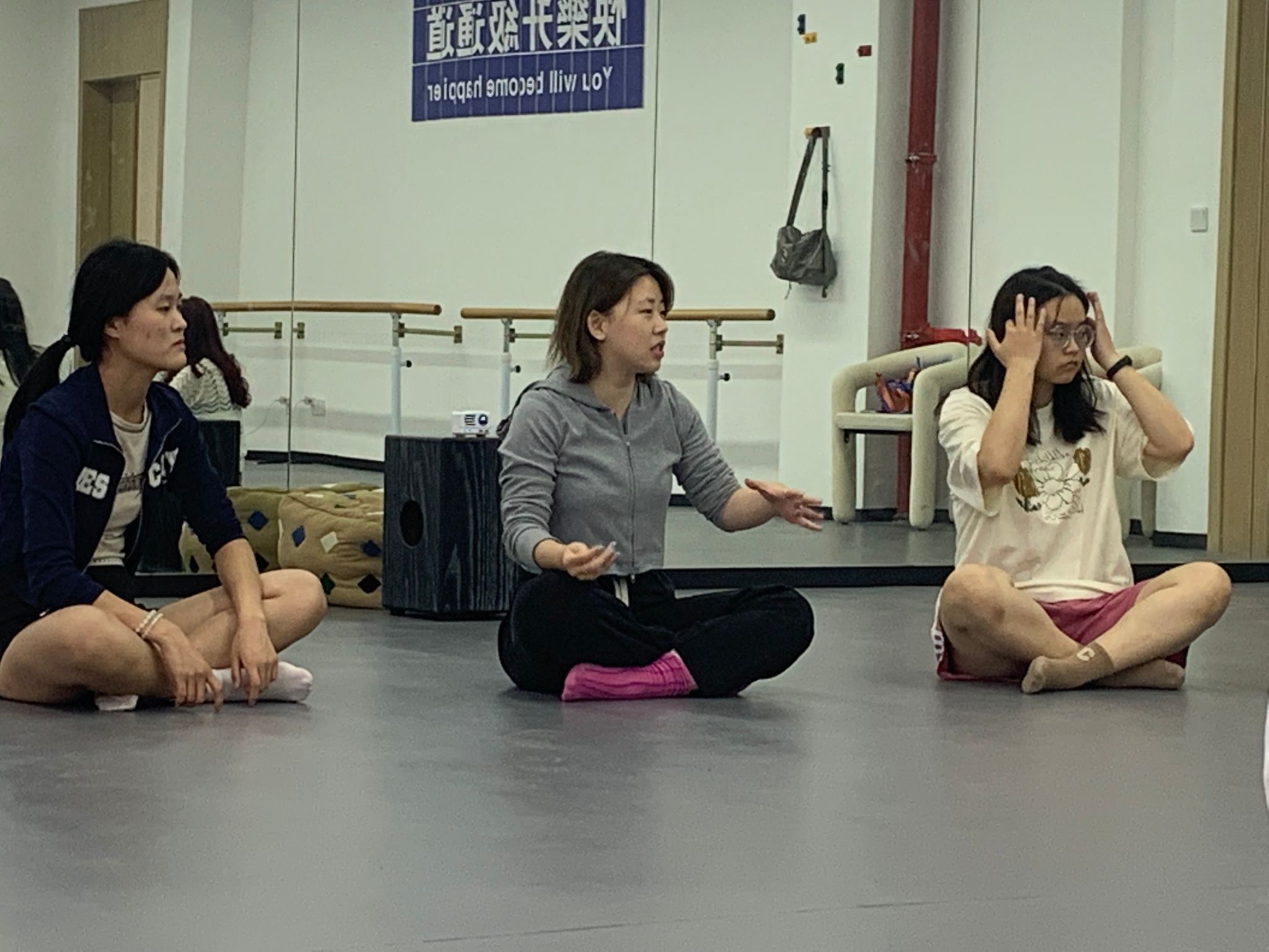 “新媒体舞蹈是传统舞蹈与新媒体技术相结合的新型舞蹈。在传统的舞蹈表演中,表演者是舞台上的主角,布景和道具等仅仅起着辅助作用。随着新媒体技术的不断发展,整个舞台环境和舞蹈表演正在发生着翻天覆地的变化......”活动伊始,李玟谕老师组织同学们席地而坐,讲解了新媒体舞蹈的基础知识,同学们对“新媒体舞蹈”这一新概念充满了兴趣,积极与李玟谕老师互动,不断汲取新的知识。