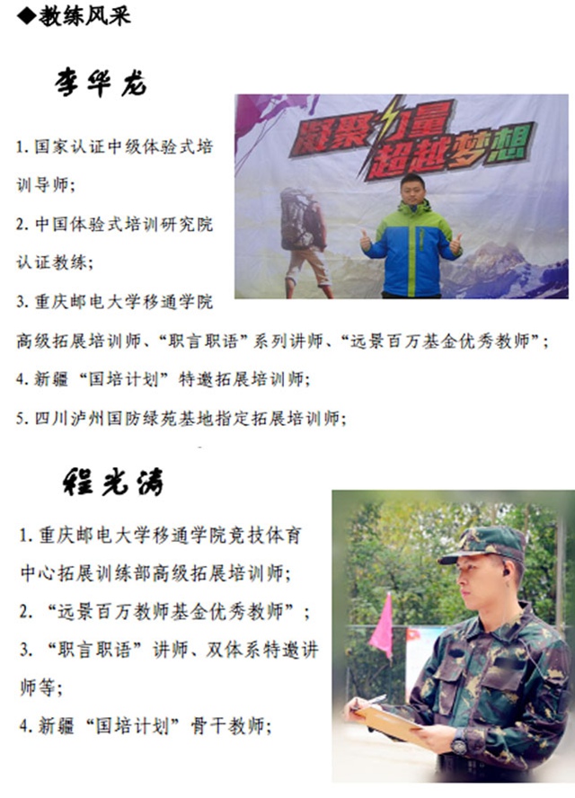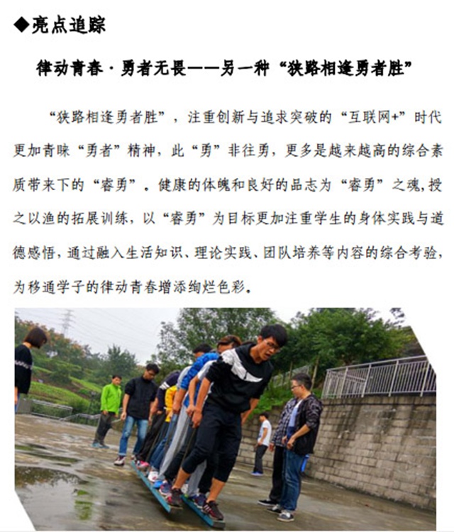 本期看点: 十月拼搏强体魄 素质拓展实质 野外生存装备介绍 教练风采 律动青春•勇者无畏——另一种“狭路相逢勇者胜” 厉害了!“战狼”集结,号角阵阵 青春的历练——体验“城市定向”越野拉练 踏出第一步才明白一切都不是那么难 拓展感悟