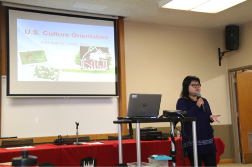 终于在完成前期准备工作之后我们正式踏入了课堂,在各自的简单的自我介绍之后我们迎来了任萍萍老师的授课。她首先问了我们对于美国的初印象,大家的回答各有不同却又有不少共同点。不过无论怎样,美国初印象是离不开“蓝天,空气,风景,人情”几个词的。之后任老师也给我们介绍了关于美国文化的多样性以及Niu的背景环境和简介。在本次课程中也可以说受益良多,了解到了美国人基本的生活习惯以及基础的社交礼仪,同时对于咱们的“牛”大学也有了一个进一步的认识。