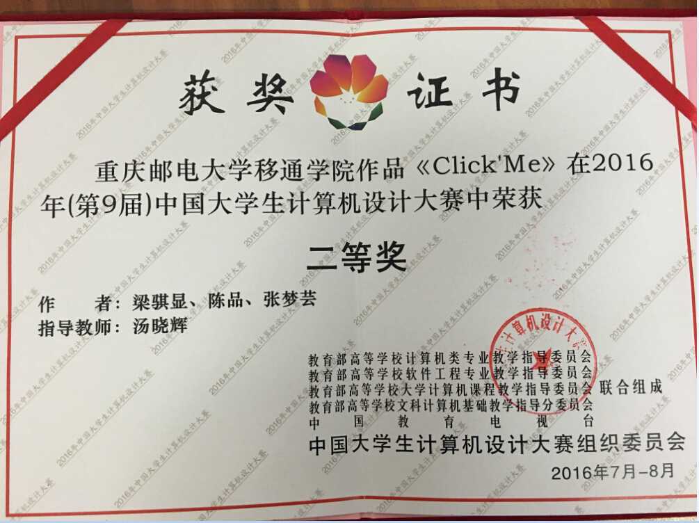 软件服务外包类全国决赛于8月13日-19日在南京东南大学举行,由汤晓辉老师指导,来自通信工程专业的双体学员陈品、计算机科学与技术专业的双体学员梁骐显、自动化专业的双体学员张梦芸共同开发的《Click’Me》在与来自全国各高校的220支参赛队伍的激烈竞争中依靠出色的发挥获得全国二等奖。