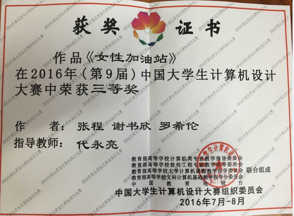 软件应用与开发类决赛于8月22日-26日在上海华东师范大学举行,由代永亮老师指导,来自信息管理与信息系统专业的双体学员张程和谢书欣、工程管理专业的双体学员罗希伦共同开发的《女性加油站》,经过紧张激烈的比赛,在全国各高校357支队伍的竞逐中,凭借优异的表现最终获得全国三等奖。