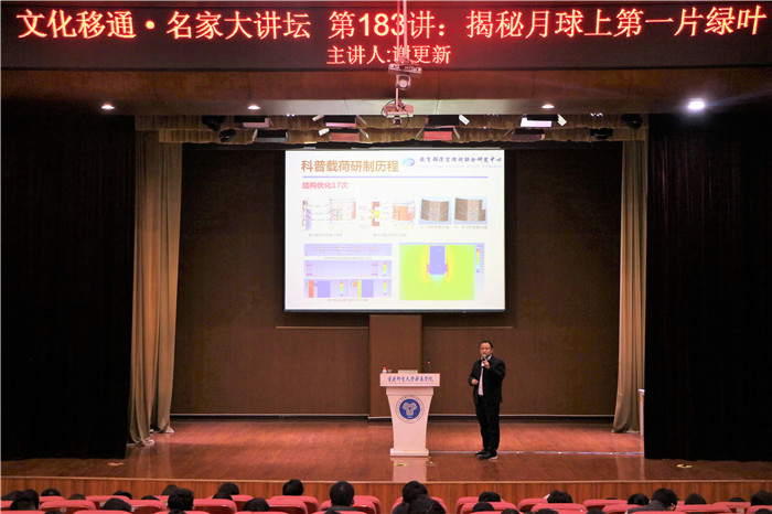 谢更新教授首先向我们介绍此次科普生物载荷试验的试验成果,试验总共历经212.75个小时,用将近9天的时间完成。1月12日晚8点嫦娥四号登陆月球背面的生物科普试验载荷传回来的最后一张试验照片,显示载荷内生长出来的植物嫩芽长势良好,这代表人类在月球上种植出第一株植物嫩芽,昭示着人类首次成功完成月球表面生物生长的培育试验,同时也在月球背面留下了中国探月的第一行足迹。这个试验的立项背景是为了响应国家的号召“以科学推动发展”进行科学研究。更是为了在更大范围内充分发挥探月工程在科技领域的牵引带动作用,从而激发社会公众探索宇宙的热情和创新能力。