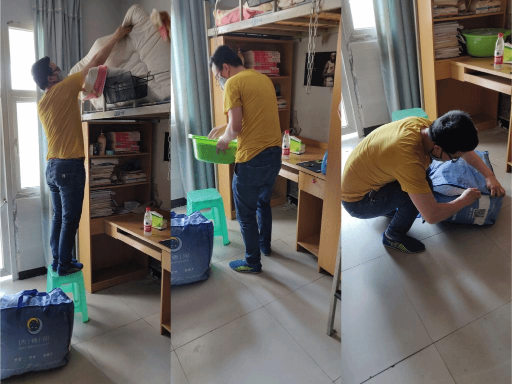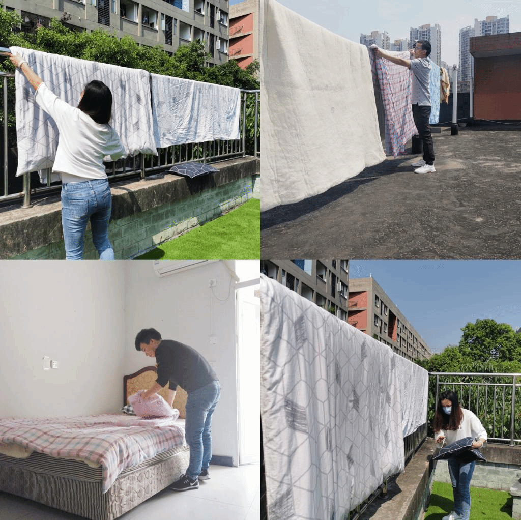 “劳动最光荣、劳动最崇高、劳动最伟大、劳动最美丽。”晒被子可是个体力活儿,看似很轻的棉被,搬到楼顶,整理好做上标记,时不时还要给被子“敲敲打打”、“翻个身”,从晒到收,从一楼到六楼,从楼上到楼下,每个人都满头大汗,不停地大喘气。“帮学生从山上搬物品到山下、整理内务,晒被子虽然很辛苦,但想到同学们返校后有一个温暖舒适的环境,大家都觉得蛮开心的。”刘明东老师笑着说道。