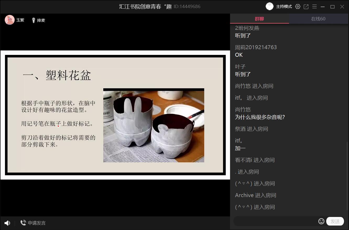 4月15日16时,创意青春“趣课堂”系列活动第二期邀请到了DIY手工协会的龚雪同学,通过线上直播的方式为近200名书院学子分享了变废为宝的创意和手工制作的小技巧。