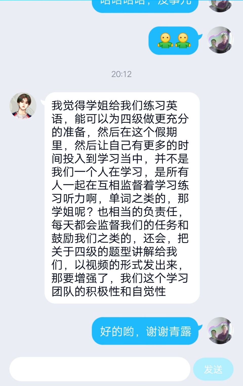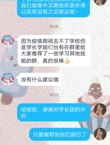 与朋辈互助团成员的交流和互动中,我们还收到了这样一些反馈。“自从跟着学姐一起学习之后,感觉自己每天都好积极、好自律。”这是在一次线上交流中,成员们和朋辈学长团吴萍学姐谈到学习时的有感而发。我想也是因为吴萍学姐一直以来的督促和关心,她和她的小伙伴们都能够在自律的学习中坚持下去,也能够在未来更好的营销自己。“虽然因为疫情去不了学校,但学长学姐们给我们提供了很多资源,在这里我除了计算机练习,我还可以学习PS。”2019级别都书院、淬炼商学院的江榕同学也在交流时这样说到。这也正是体现了我们朋辈互助团共享、共进、共赢的目标,我们不仅能在圈层内和学长学姐们互助互促,还能通过圈层联动,实现多种资源共享。