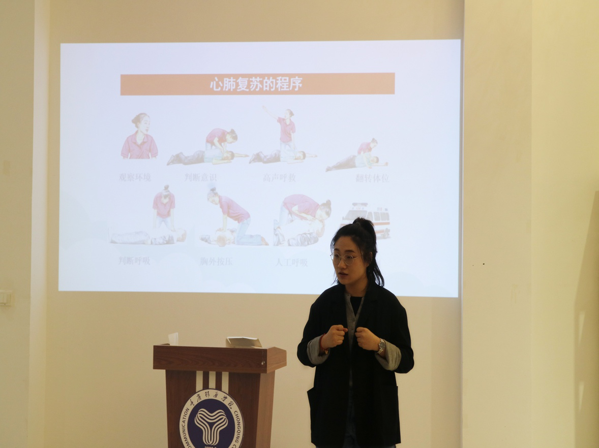 活动开始,首先由蓝天应急救助志愿服务专项支队的支队长黄钰涵为同学们讲解身边的应急事件,她以现代大学生熬夜猝死的调查视频开始,通过一张睡眠被剥夺的后果图,引入大学生学习心肺复苏的必要性和实现心肺复苏全校覆盖的重要性。