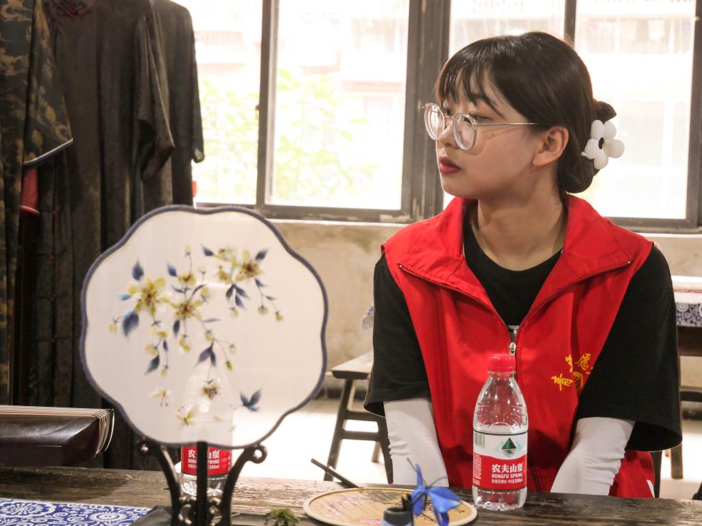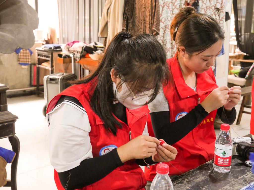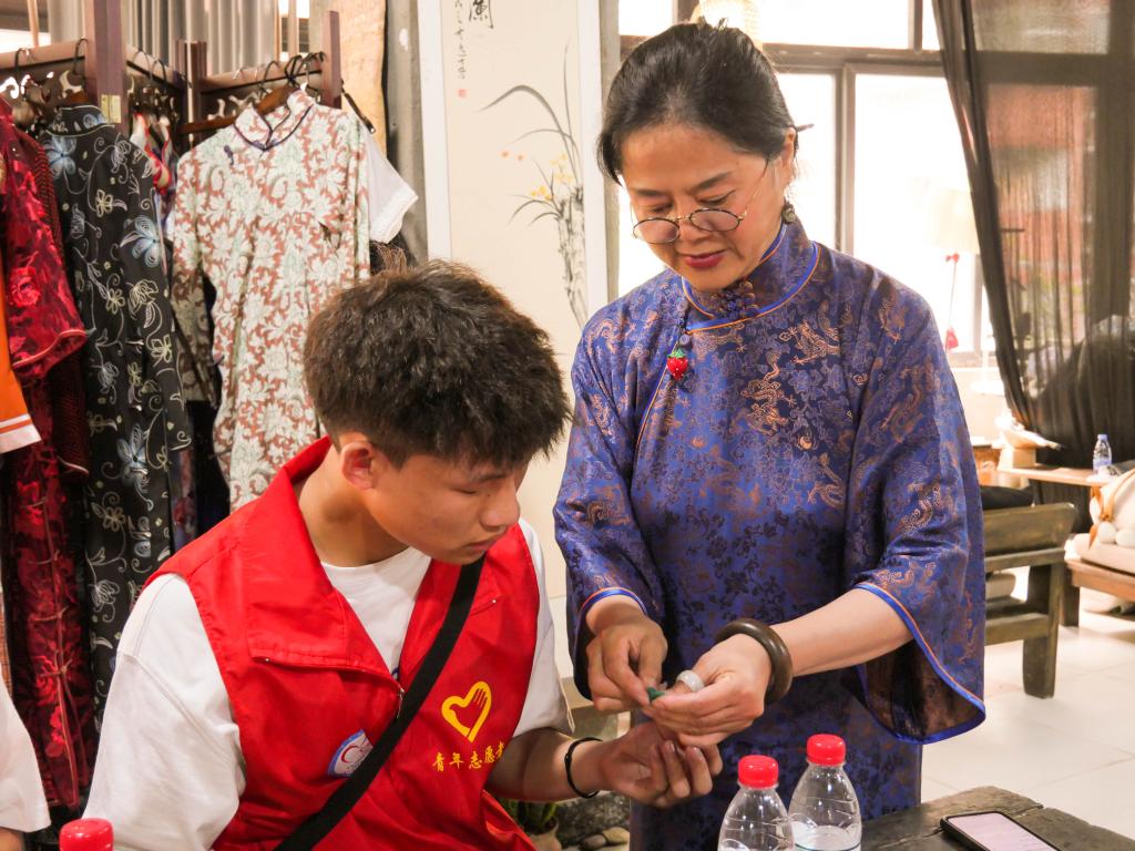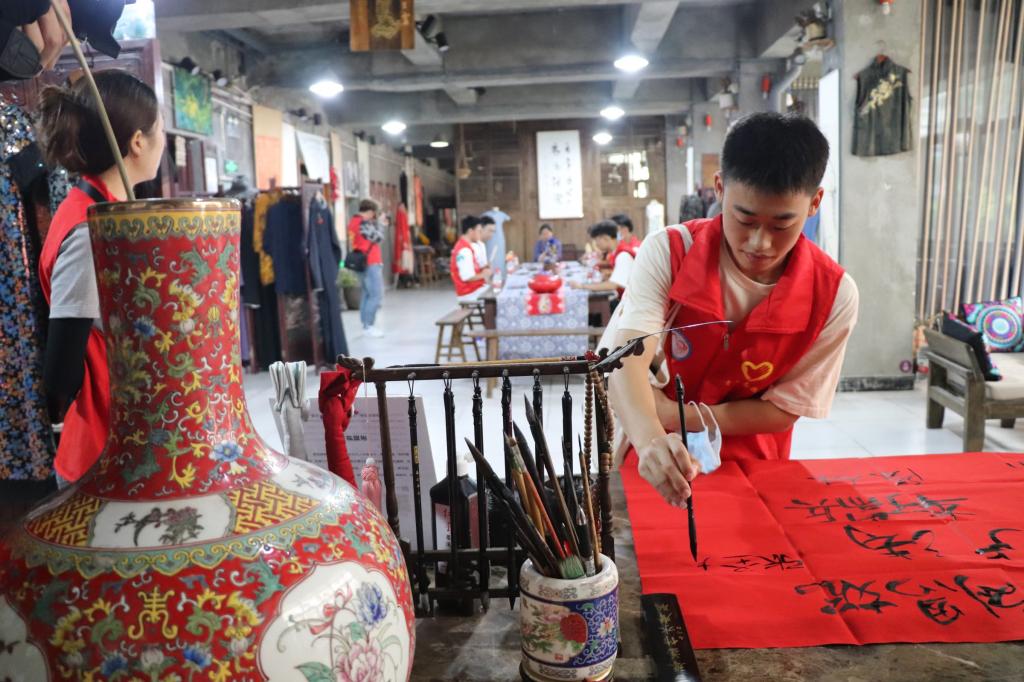 上午10:00,实践团到达君临百年旗袍博物馆,第四代传承人李绅源老师带领大家敲打店门前的锣鼓,李老师表示,敲锣打鼓是为了让门口的门神、财神听见,门神辟邪,财神招财,起美好祝福之意。进入馆内,实践团成员依次使用毛笔在红纸上签名,并落座马凳,第三代传承人蒋玲均老师向实践团介绍了桌上摆放的绒花、扎染、刺绣、竹编等非遗工艺品,同时指导实践团体验刺绣,制作专属自己的“钱多多”。