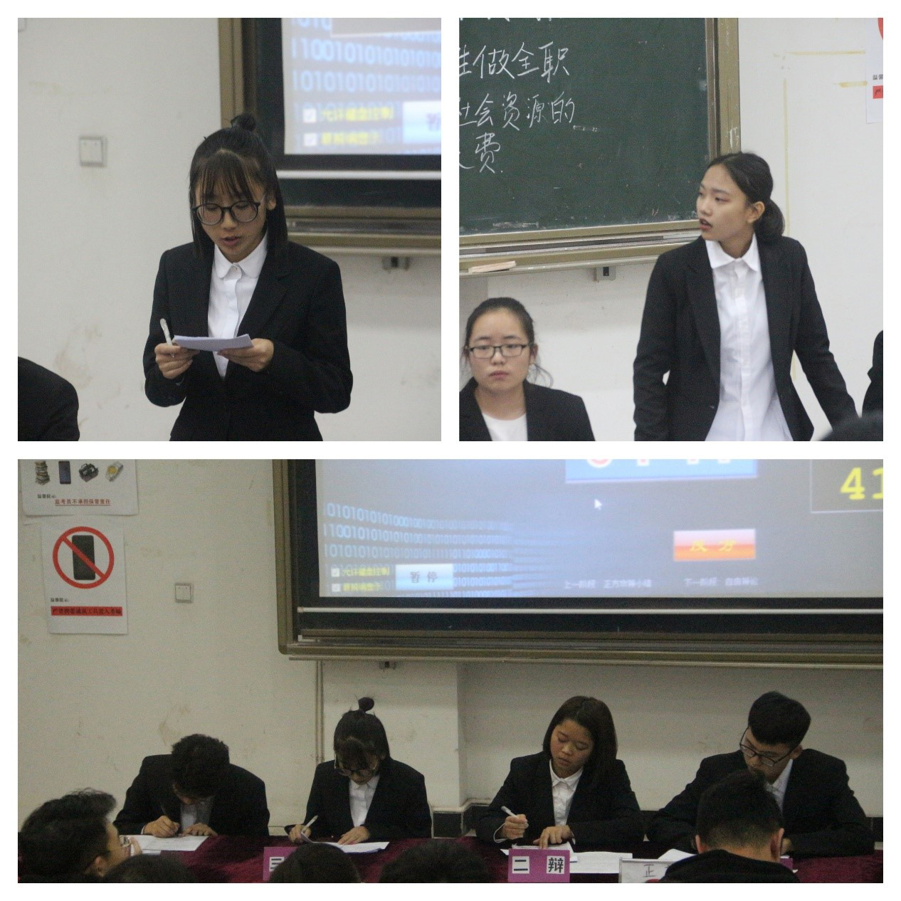 同样的还有智能工程学院的两支队伍。双方辩手分别就“评论行为的善恶看结果”与“评论行为善恶看动机”开展了激烈的答辩。所谓善就是在人与人的关系中表现出对他人,对社会有益的行为。恶则是对他人对社会有害的行为。而行为的动机对局外人而言往往是模糊的。因此评价行为的善恶更多的是从清晰的结果出发。一辩以慷慨激昂的语气,有理有据的例子对“善恶,何人评论”等关键词汇进行精辟的解读“老人倒下你服不服”、“黄金棍下出好人”等举例不让对方有缝可插。自由辩论环节更是重头戏。辩手们也在这一刻集思想性、逻辑性、明辨性于一体火力全开,有时也奋笔勤书,倾听对方的叙述来破解对方的漏洞。在计时提示音的滴滴答答中,这场思维的巅峰之战在双方总结成词中结束了。