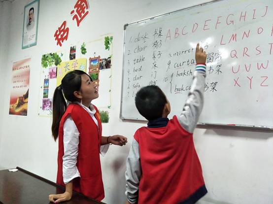 (志愿者利用自己专业知识,为留守儿童教授基础英语)