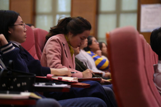 讲座现场,每个同学都聚精会神,认真聆听老师们精彩的演讲。听者讲者上下互动,孙晓芳老师与同学们共同探讨版权意识,并提出发布微信公众号推文中容易出现的排版问题,以此为基础又引申出文章风格、图文统一、字符大小等一系列细节问题。并以生活实事为例,点明掌握新媒体技术在今后工作中的重要性,营造出良好的宣讲氛围。
