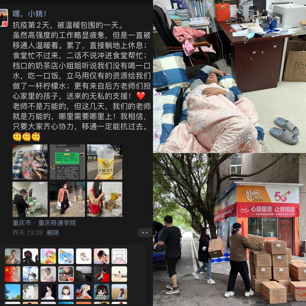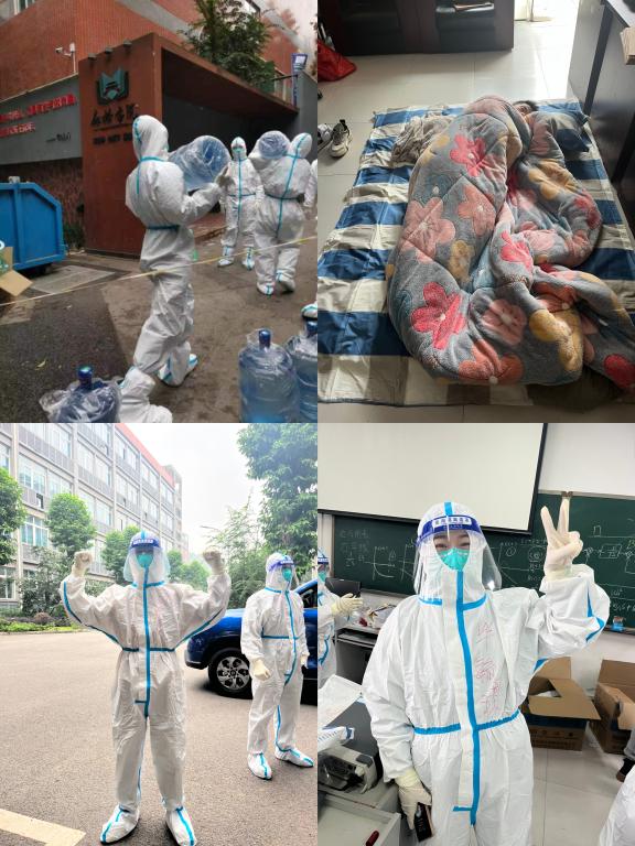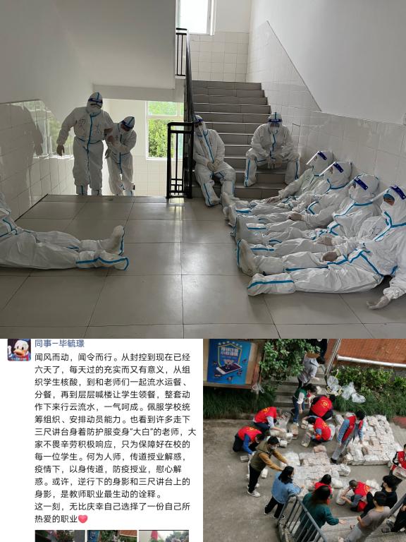 教师志愿者毕毓璟老师——不负胸前的这枚党徽:从入校到现在,每天过得充实而又有意义。从组织学生核酸,到和老师们一起流水运餐,再到层层喊楼让学生领餐,整套动作下来行云流水,一气呵成。虽然一整天下来也会疲惫不堪,但看到别在胸前的党员徽章,看到许多走下三尺讲台身着防护服变身“大白”的老师们,看到大家加油打气的声音,顿时又觉得充满力量。有时想想,何为人师,传道受业解惑,疫情下,以身传道,防疫授业,慰心解惑, 只为不负学生期待,不辱教师使命。老师们共同努力,定会再见阳光!