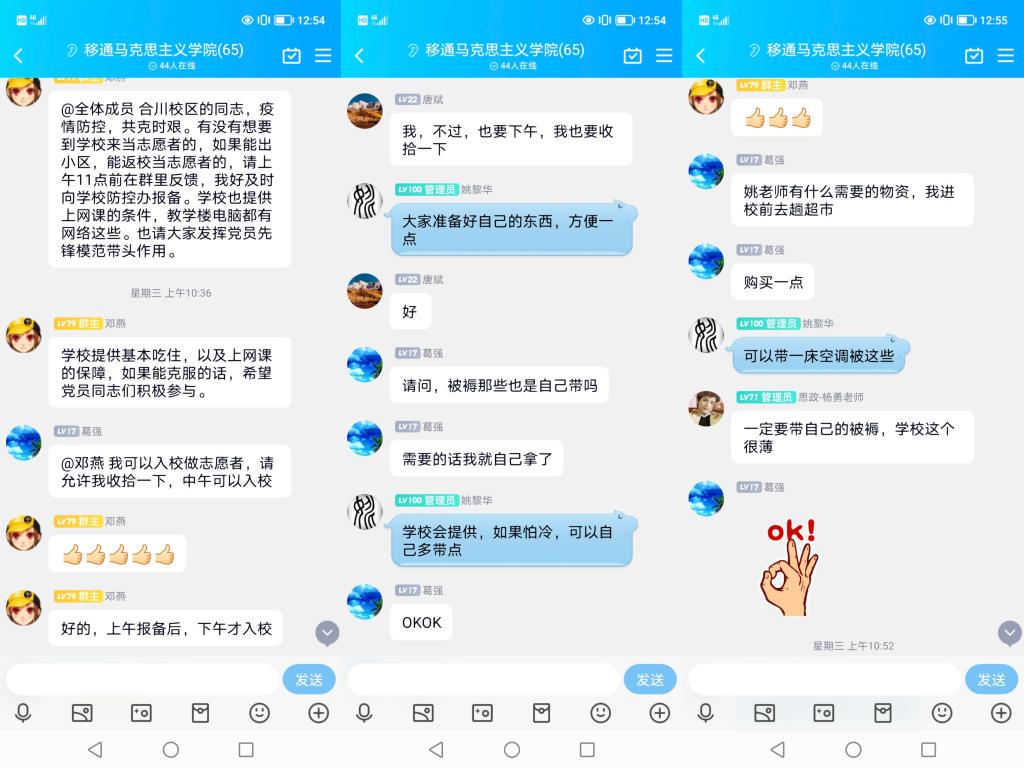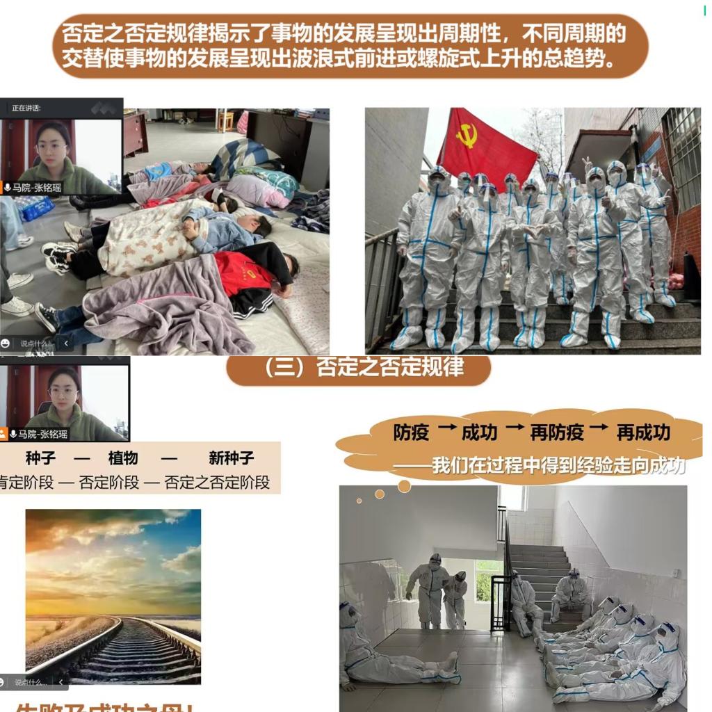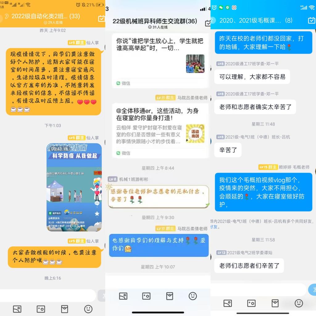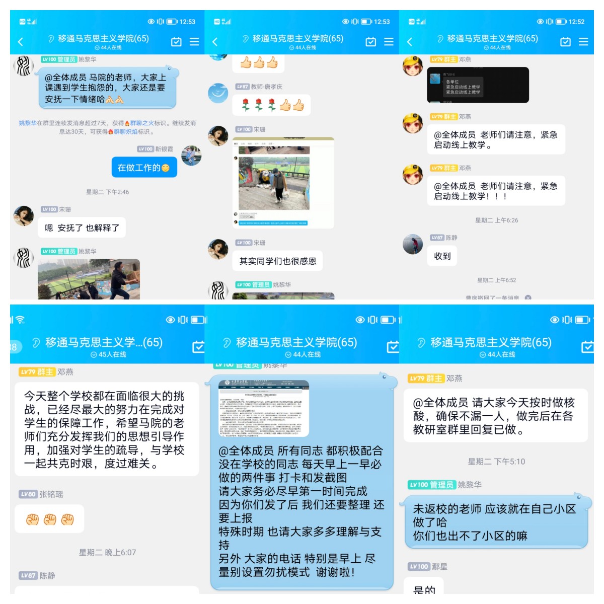 面对疫情防控严峻形势,马克思主义学院立即响应学校疫情防控的部署要求,第一时间将学校的工作部署落实到位,及时传达疫情相关通知、信息、逐人摸排情况,并督促全院师生及时进行核酸检测,上报防疫健康信息。同时,邓燕院长对全院教师的教学工作提出新要求,在要求老师们线上教学做到质量不降低,不打折的同时,鼓励老师在线上多与学生进行交流互动,加强思想引领、教育引导,确保疫情防控期间学生日常教育管理“不掉线”。