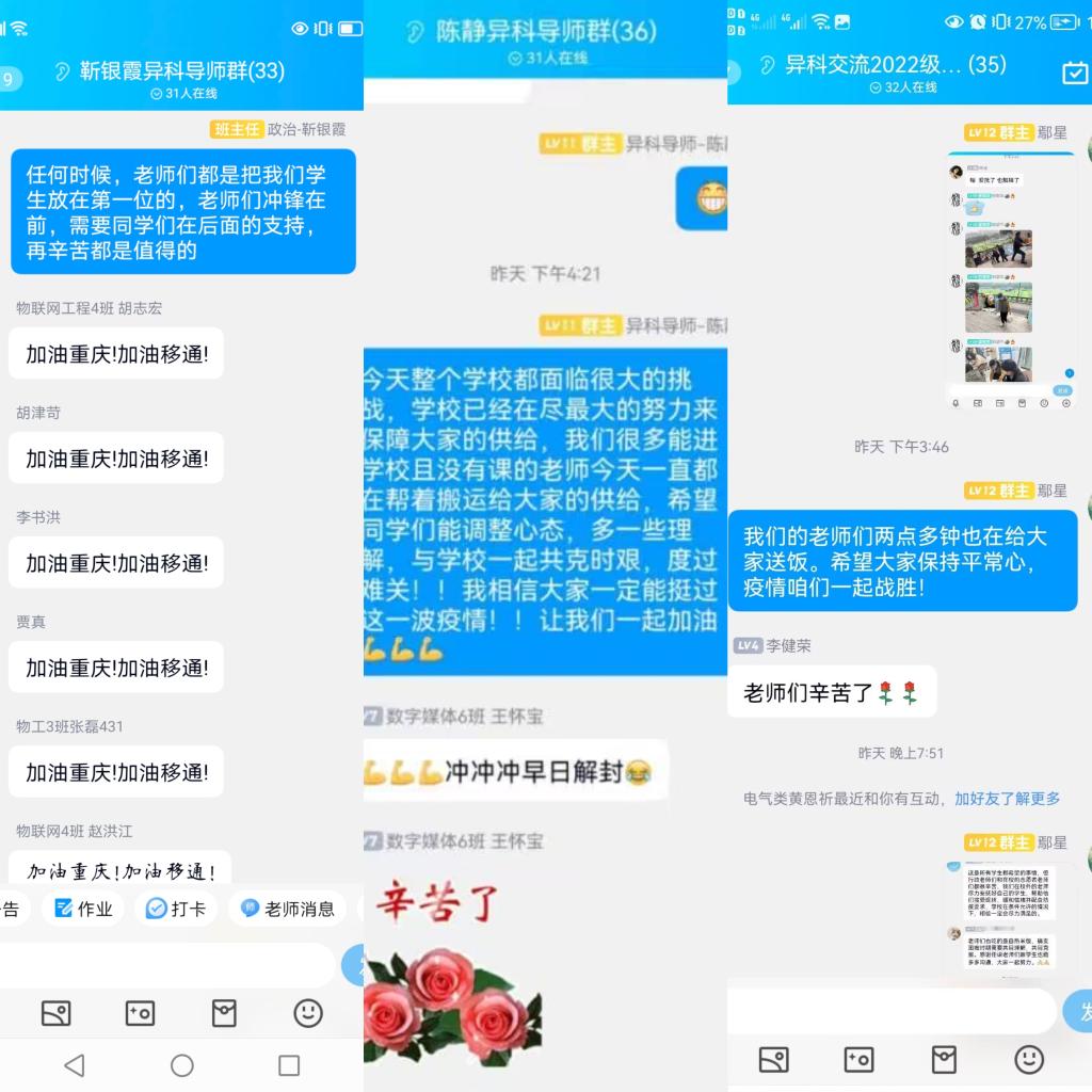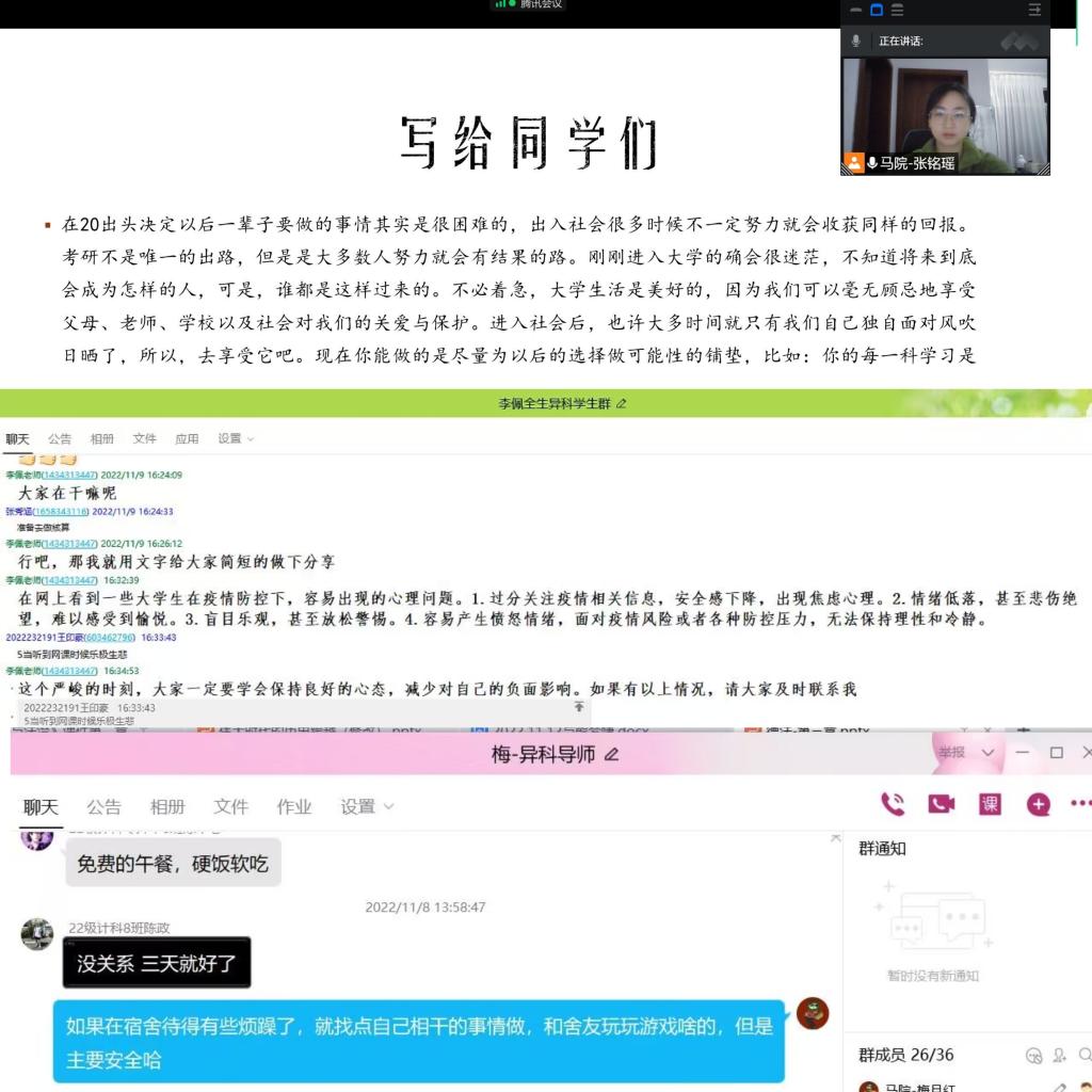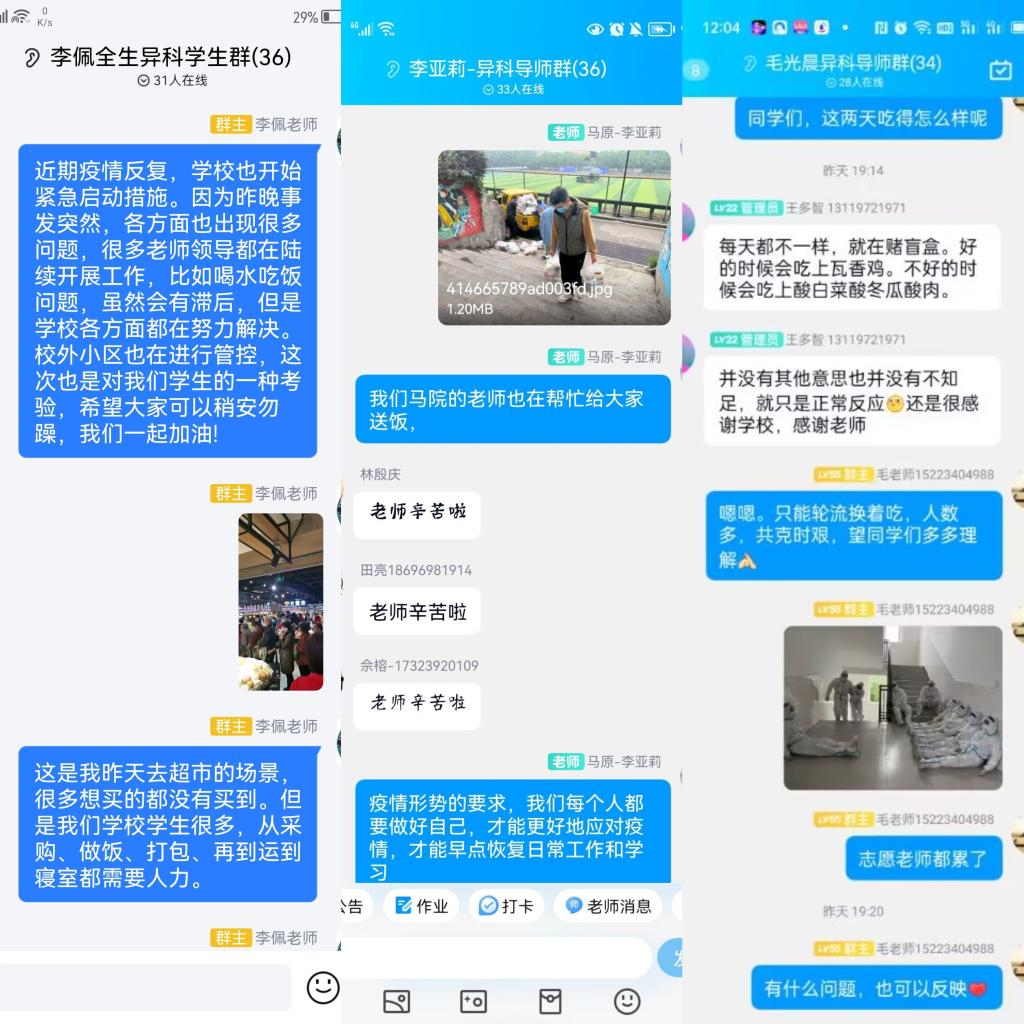 马克思主义学院教师们积极利用异科导师平台,发挥思政课教师角色优势,一方面通过线上活动开展爱与感恩教育,向同学们讲述学校战疫故事,引导学生从学校和志愿者老师们的大爱中学会感恩,争做充满爱、传播爱、奉献爱的青年大学生;另一方面,聚焦学生心理疏通,及时关注学生精神状态和思想动态,针对可能出现的焦虑不安等心理情况,开展线上心理疏导工作,解答学生困惑,帮助学生正向思考,树立健康心态;另外,导师们在积极传达学校防疫工作开展的最新情况,鼓励同学们坚定必胜信心的同时引导学生理性对待疫情,提高站位,做到不信谣不传谣不造谣,积极传播疫情防控工作正能量,以力所能及之力为防疫作出贡献。
