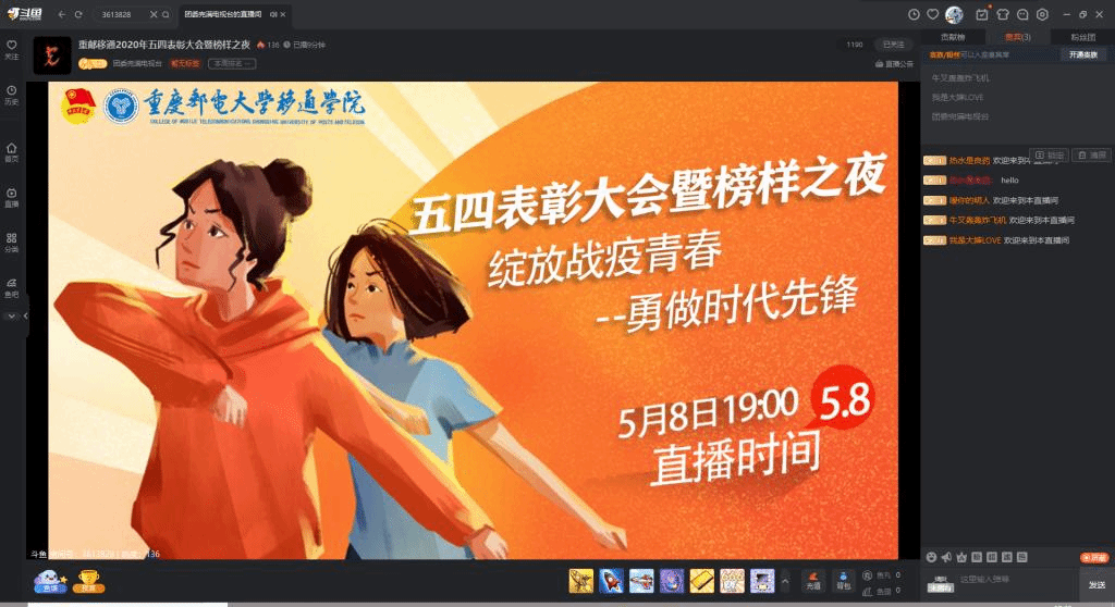 为激发我校青年学生的责任与担当,坚决打赢疫情防控阻击战,深入推进爱国主义教育,传承并弘扬五四精神,引导广大青年学生以青春之我、奋斗之我,在新时代勇立潮头、磨炼本领,为中华民族的伟大复兴贡献青春力量。5月8日19:00整,重庆邮电大学移通学院2020年“绽放战疫青春·勇做时代先锋”五四表彰大会暨榜样之夜在云端和广大师生见面,累计1500余人参与其中,直播间最高热度达1.6万。师生们在弹幕区QQ空间积极互动,交流分享,展现出移通青年的青春活力。